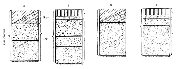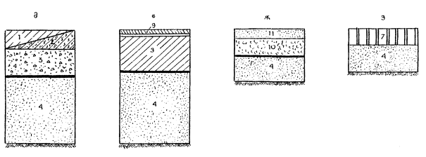 Рис. 1. Варианты конструкций дорог, тротуаров, площадок: а, б - дороги, проезды; в - проезды, тротуары,