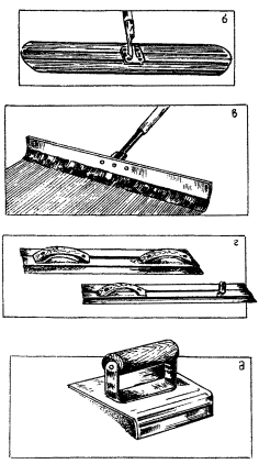 4.2. Технология строительства покрытий из литых бетонных смесей4.2.1. Для качественного производства работ с применением литых бетонных смесей необходимо качественное приготовление самой бетонной смеси в заводских условиях, применение надлежащих исходных материалов, точная их дозировка, в т. ч. химдобавок, ритмичная поставка смеси на объект в соответствии с необходимым объемом, выполнение всех необходимых требований укладки, отделки и ухода за уложенной в конструкцию бетонной смесью, своевременная нарезка швов, лабораторный контроль качества производства работ. 4.2.2. К началу работ по устройству покрытий из литых самоуплотняющихся бетонных смесей на морозозащитный или подстилающий слой песка, песчано-гравийной смеси, уплотняемой щебеночной смеси укладывается гидроизоляционный материал (полиэтиленовая пленка, пергамин, толь, рубероид) внахлест. По бетонному основанию гидроизоляционный материал не укладывается. 4.2.3. При устройстве покрытий из литых бетонных смесей роль опалубки могут выполнять бортовые камни, а при их отсутствии используют инвентарную металлическую опалубку. Опалубка устанавливается по отметкам на участке длиной, обеспечивающей непрерывное устройство покрытий в течение смены и должны иметь герметичные стыковые соединения. При односкатном профиле дороги опалубку устанавливают на всю ширину покрытия, при двухскатном - на половину ширины. 4.2.4. Литая бетонная смесь доставляется на строительный объект только в автобетоносмесителях. Во время движения автобетоносмесителя бетонная смесь должна перемешиваться. Температура бетонной смеси, доставляемой на объект при температуре наружного воздуха от минут 5 °С до минус 10 °С и от минус 10 °С до минус 15 °С, должна быть не ниже плюс 10 °С и плюс 15 °С соответственно. С этой целью для приготовления бетонной смеси на заводе применяют подогретые материалы либо горячую воду температурой до 70 °С. Выгрузка смеси из автобетоносмесителя осуществляется самотеком по лотку, распределяется предварительно путем поворота лотка и перемещения автобетоносмесителя. Во избежание расслоения бетонной смеси угол наклона лотка должен быть в пределах 45 - 60 °С. При невозможности выгрузки и предварительного распределения бетонной смеси непосредственно на место укладки с помощью автобетоносмесителя в паре с автобетоносмесителем используется автобетононасос для подачи смеси в удаленные, недоступные для автобетоносмесителя места. 4.2.5. После предварительного распределения и уплотнения под действием собственной массы смеси производят ее дополнительное распределение, уплотнение, профилирование, выглаживание и, при необходимости, придание определенной фактуры (рисунка) с помощью специального комплекта ручного оборудования без применения громоздкой механизированной техники. В качестве такого оборудования может быть рекомендован комплект типа фирмы «Гольдблатт». 4.2.6. Комплект оборудования фирмы «Гольдблатт» состоит из ручных приспособлений (инструментов), предназначенных для выполнения определенных технологических операций при укладке литых бетонных смесей. На рис. 2 представлена минимальная номенклатура инструментов комплекта: - разравниватель алюминиевый с деревянной рукояткой для выравнивания (подправки) песчаной подсыпки и предварительного распределения бетонной с