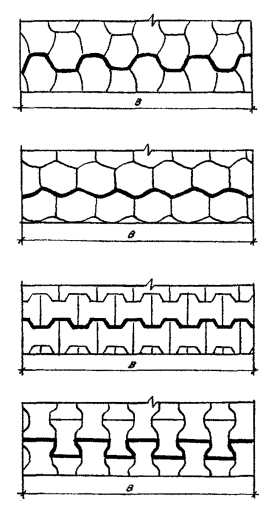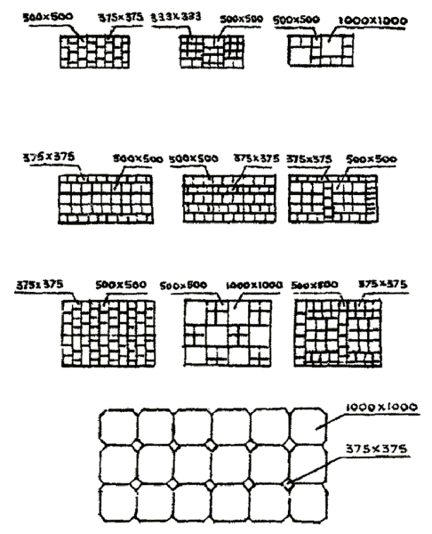 Рис. 3. Схемы раскладки тротуарных плит. Рис. 4. Типы и схемы раскладки фигурных элементов мощения. Рис. 5. Расположение швов расширения в покрытии тротуара. Основные требования к малым архитектурным формам аналогичны требованиям на остальные изделия для комплексного благоустройства территорий жилых комплексов: высокая долговечность, эстетичность, экологическая чистота. 5. ТРЕБОВАНИЯ К ФИБРОБЕТОНУ И ИЗДЕЛИЯМ ИЗ СТАЛЕ- И СТЕКЛОФИБРОБЕТОНА5.1. Сталефибробетон используется для изготовления изделий из тяжелого крупнозернистого бетона: оголовков колодцев, бортовых камней, лотков, дорожных и тротуарных плит, а также устройства монолитных покрытий на уклонах более 30 %. Содержание стальной фибры от массы бетонной смеси в пределах 2 - 3 % является оптимальным. Длина фибр не должна превышать 40 мм, а отношение длины к диаметру (сечению) l/d не более 80 - 100. 5.2. Рекомендуемые составы сталефибробетонных смесей приведены в таблице 13. Таблица 13 Состав сталефибробетонных смесей