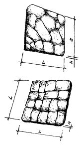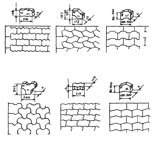каток; б - гладилка; в - щетка; г - затирки; д - затирка угловая. Смесь, уложенная на уклонах, после укладки доуплотняется прокаткой ручного двухвальцового катка движением снизу вверх. Для того чтобы не наступать при этом на бетонную смесь используются трапы, укладываемые поперек дороги (тротуара) на бортовые камни. 4.2.8. Из цветного бетона устраивают как однослойное покрытие, так и двухслойное. Устройство двухслойного покрытия с цветным бетоном в верхнем слое толщиной 6 - 8 см осуществляется двумя способами: одновременная и раздельная укладка нижнего слоя из обычного бетона и верхнего - из цветного. Раздельная укладка производится в два этапа: укладка и уплотнение, при необходимости, нижнего слоя, уход за ним, а затем укладка цветного бетона в верхний слой на следующий день без заезда на ранее уложенный бетон с применением бетононасоса либо автобетоносмесителя с боковой разгрузкой, или с заездом автобетоносмесителя, но не ранее чем через 7 сут после укладки нижнего слоя. При использовании для устройства нижнего слоя малоцементного бетона с низким водосодержанием сразу после укладки и уплотнения укладывается следующий технологический слой дорожных одежд с возможностью заезда автобетоносмесителя и других автотранспортных средств. Для получения хорошего сцепления слоев покрытие нижнего слоя необходимо очистить и промыть, затем нанести на эту поверхность слой толщиной 3 - 5 мм активизирующего цементно-песчаного раствора с осадкой конуса 3 - 6 см. 4.2.9. В конце рабочей смены устраивают поперечный температурный шов с применением металлического шаблона, обернутого пленкой, на полную ширину и высоту укладываемой полосы дороги. Шаблон закрепляется к грунту и бетону металлическими штырями. Перед возобновлением работ шаблон снимается. 4.2.10. Уход за бетоном осуществляется сразу после его укладки и отделки с помощью полиэтиленовой пленки, водонепроницаемой бумаги, пергамина, толя, дорнита. Продолжительность ухода за бетоном с периодическим его поливом в летнее время осуществляется в течение 7 сут. При выполнении работ в условиях отрицательных температур поверх указанных материалов укладывают слой сухого песка, грунта, опилок, шлака или снега. С наступлением теплой погоды весной уложенный зимой бетон поливают до достижения им проектной прочности, но не менее 10 - 15 сут, считая со времени повышения среднесуточной температуры до 0 °С. 4.2.11. Температурные швы сжатия нарезаются в отвердевшем бетоне на вторые-третьи сутки на глубину 1/4 - 1/3 толщины покрытия и заполняются цементно-песчаной смесью. 4.2.12. Декоративность дорогам, площадкам, тротуарам или отмосткам при комплексном благоустройстве территории эталонных объектов может быть придана нанесением на их поверхность как из обычной, так и из цветной бетонной смеси, различных рисунков - от простейшего геометрического членения покрытия на отдельные плиты до более сложных композиционных узоров. Для нанесения рисунка геометрического характера используют нарезчик швов. Швы ложные, расположение их имитирует плиты требуемого размера и конфигурации. Для нанесения рисунка на поверхность покрытия используют также различное оборудование, специальные матрицы, валики, позволяющие создавать на свежеуложенной смеси различные рисунки. 4.3. Технология строительства сборных покрытий.4.3.1. Монтаж сбор