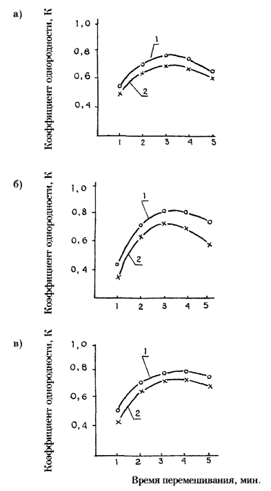 Зависимость прочности сталефибробетона от технологии его приготовления приведена в приложении 6, степень однородности распределения стальных фибр в зависимости от вида бетоносмесителей и времени перемешивания приведена на рис. 6. 5.4. Для изделий, к внешнему виду которых предъявляются повышенные эстетические требования - ограждения, садовые и парковые дорожки, в отдельных случаях бортовые камни, малые архитектурные формы, - используется стеклофибробетон на основе тяжелого мелкозернистого бетона с применением щелочестойких стеклянных волокон. Применение стеклофибробетона позволяет повысить физико-механические показатели изделий или снизить толщину стенок (сечение). Рис. 6. Степень однородности распределения стальных фибр в зависимости от вида бетоносмесителей: а - гравитационный; б -