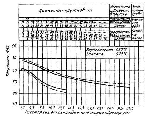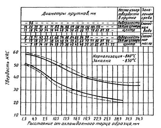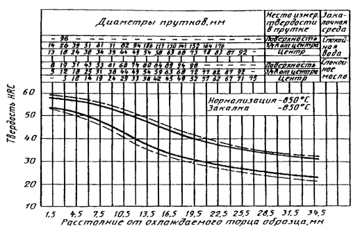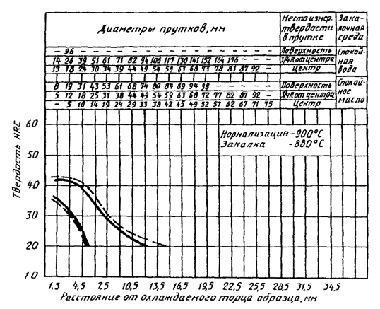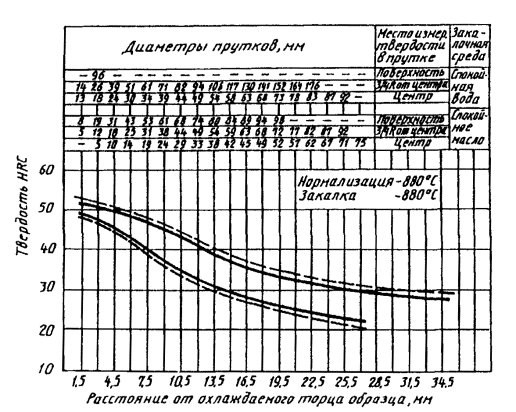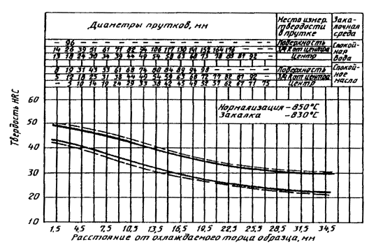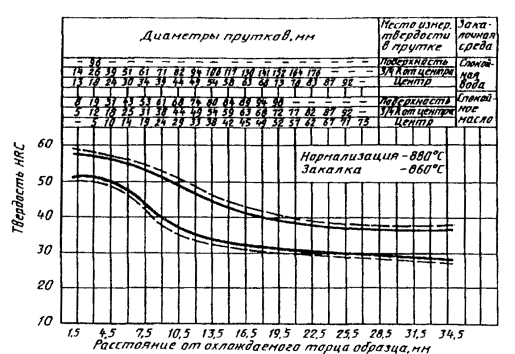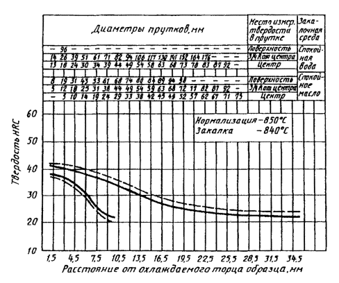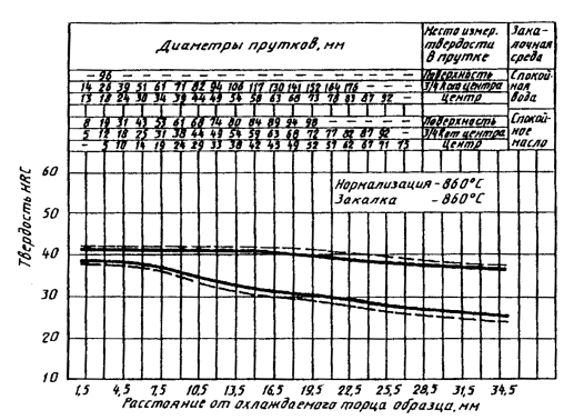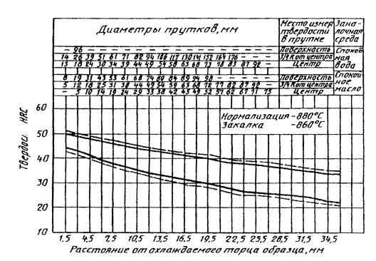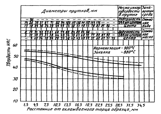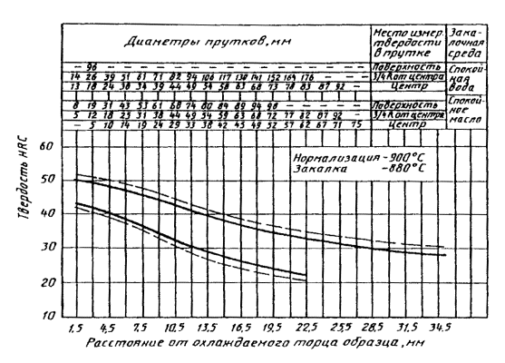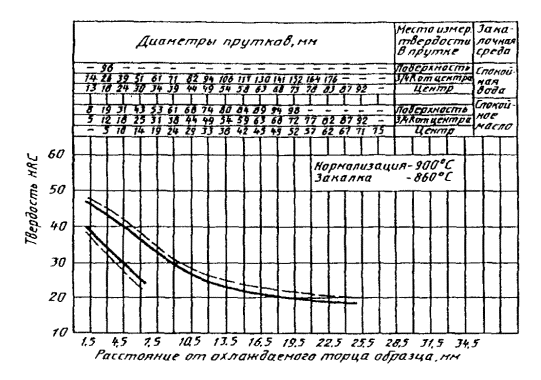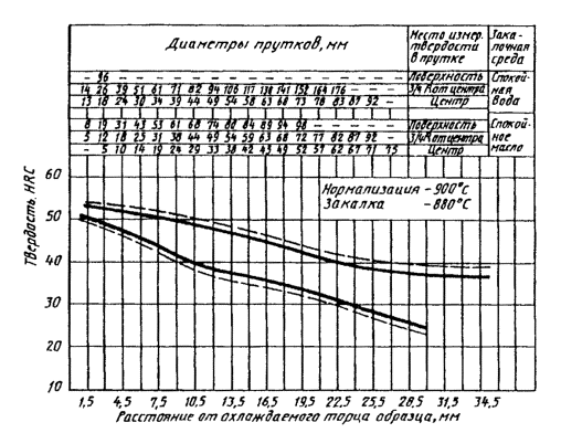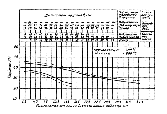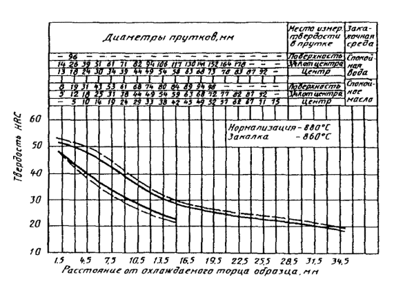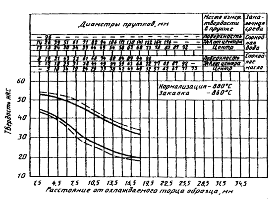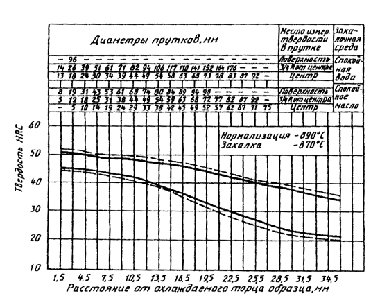 проводить вторую закалку при температуре 860 °С с охлаждением в масле. (Измененная редакция, Изм. № 4, 5). Полосы прокаливаемости и диаметры проката, имеющего после объемной закалки в воде и в масле такую же твердость, как и торцовый образец, на соответствующем расстоянии от охлаждаемого торца образца, и место измерения твердости по сечению проката приведены на черт. 1 - 18 приложения 1. Пределы колебаний твердости (максимальной и минимальной) по длине торцовых образцов для суженной и марочной полос прокаливаемости приведены в приложении 2. Для проката из стали марки 30ХРА нормы прокаливаемости устанавливаются по согласованию изготовителя с потребителем. Примечания: 1. По согласованию изготовителя с потребителем при
