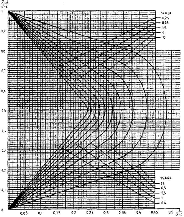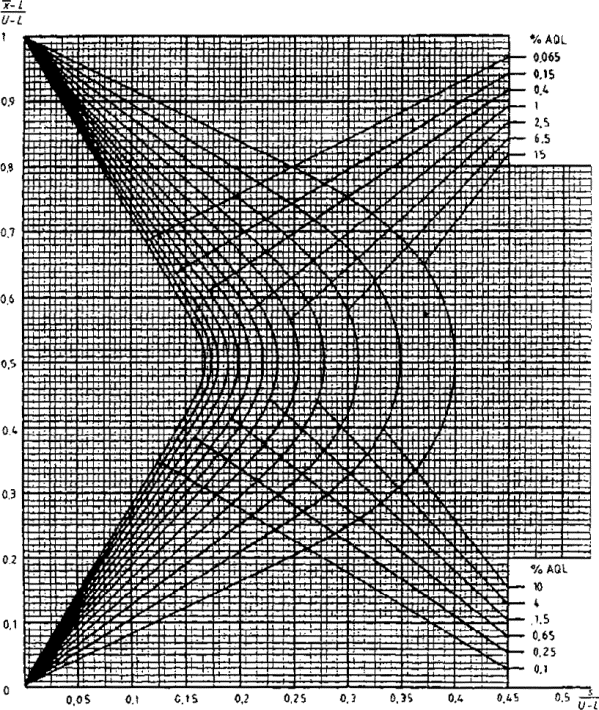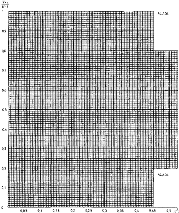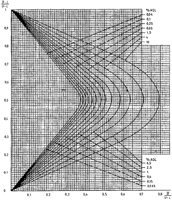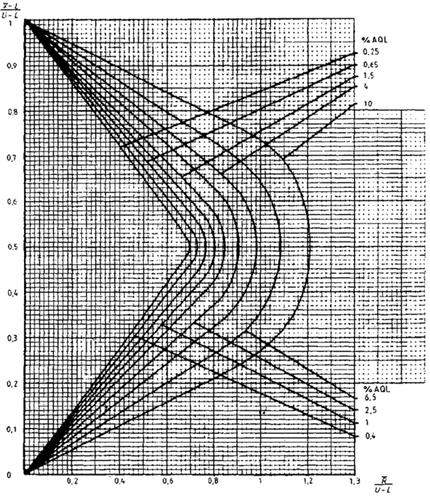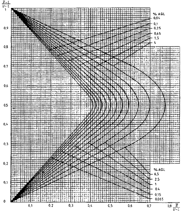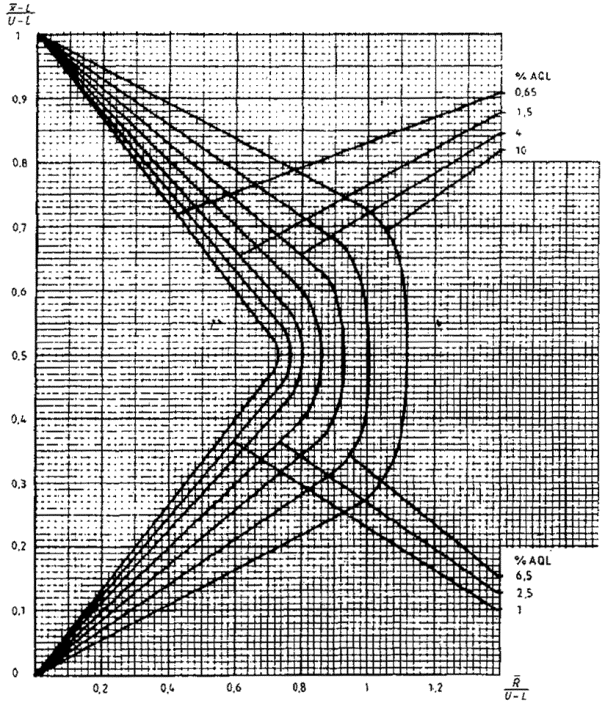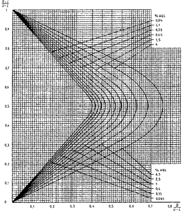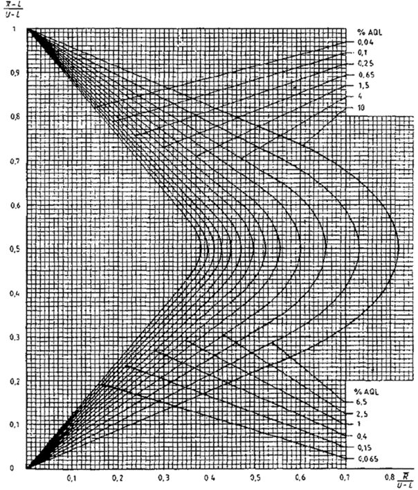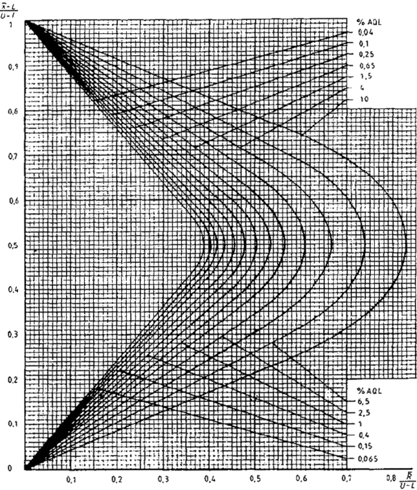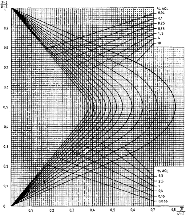 приемки для предельных значений с общим уровнем качества: R-метод для кода объема выборки L (объем выборки - 85)