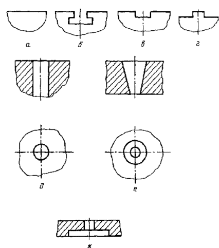 а - плоскость, б - Т-образный паз, в - П-образный паз, г - П-образный выступ, д - цилиндрическое отверстие, е - коническое отверстие, ж - цилиндрически выточка Рисунок 1 Таблица 1