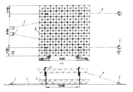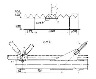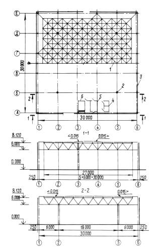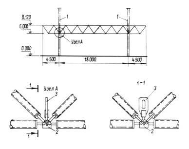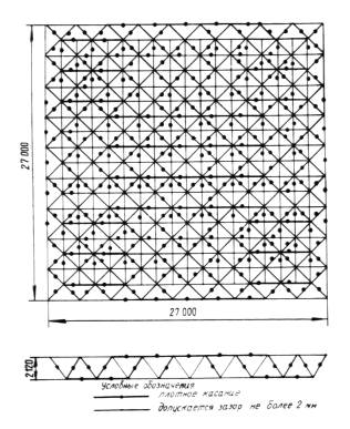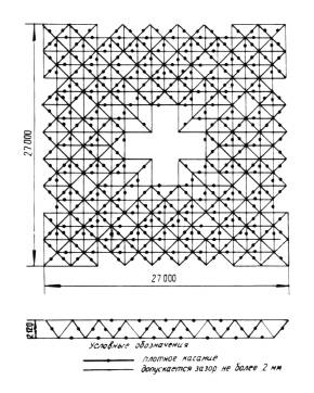 1. Общие положения1.1. Настоящие нормы распространяются на монтаж и приемку конструкций одноэтажных промышленных зданий (модулей) размерами в плане 30´30 м с пространственным решетчатым блоком покрытия из труб размерами 27´27 м (сетка колонн 18´18 м). Компоновочная схема и узлы показаны на рис. 1-5. 1.2. Нормы предназначены для работников проектных и строительно-монтажных организаций, осуществляющих монтаж конструкций одноэтажных промышленных зданий с пространственным решетчатым покрытием из труб (типа "Кисловодск"). 1.3. Монтажные работы следует производить только в соответствии с утвержденным проектом производства работ (ППР). ППР разрабатывает специализированная проектная или монтажная организация. Проект должен быть согласован с генподрядной строительной организацией в части стройгенплана и календарного графика работ и утвержден монтажным управлением в порядке, установленном "Инструкцией по разработке проектов производства работ по монтажу строительных конструкций" ВСН 193-81/ММСС СССР. 1.4. ПНР разрабатывают на основании чертежей КЦЦ с максимальным использованием прогрессивных методов работы. 1.5. Организация, выполняющая монтажные работы, обязана обеспечить соответствие выполненных работ чертежам КМД, ПИР и требованиям настоящих норм. Всякое отступление от ППР должно быть согласовано с организацией, его разработавшей. 1.6. Работы по монтажу конструкций необходимо выполнять с соблюдением требований по технике безопасности при монтаже стальных и железобетонных констатации.