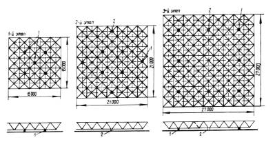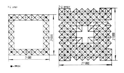 3.7. Резьба анкерных болтов должна быть предохранена от повреждений и коррозии. 3.8. Работы по подливке пространства между поверхностью фундамента и опорной частью колонн следует выполнять после выверки и составления геодезической схемы положения колонн в алане и по высоте. 3.9. Монтировать конструкции разрешается только после инструментальной проверки соответствия проекту отметок и положения в плане фундаментов, а также после их приемки. 3.10. Проверку и приемку опорных конструкций и закладных деталей производят представители заказчика, строительной и монтажной организаций с составлением акта и приложением исполнительной схемы. 4. Укрупнительная сборка конструкций покрытия4.1. Укрупнение конструкций покрытия в блоки следует производить у места подъема на выверенных по высоте и в плане монтажных опорах в такой последовательности (рис. 6, 7): нанести оси блока на бетонную подготовку под полы; установить и выверить пять опор № 1; собрать центральную часть блока размерами 15´15 м; установить и выверить дополнительные три опоры № 2; блок укрупнить до размера 21´21 м; переставить и выверить опоры № 1; блок укрупнить до размера 27´27 м; произвести выверку геометрических размеров блока; установить прогоны и настил с полным проектным закреплением. 4.2. Сборку блока следует производить от центра к краям путем последовательного присоединения элементов в такой последовательности: элементы нижнего пояса, элементы наклонные с узловыми деталями верхнего пояса, элементы верхнего пояса. Замыкание очередного пояса следует выпал-нить на элементе, не требующем плотного примыкания муфты к узловому элементу. 4.3. Отклонение верха монтажных опор в местах опирания узловых элементов нижнего пояса должно не превышать ± 5 мм. 4.4. Узловые элементы перед подачей на сборку должны быть очищены от консервирующей смазки. 4.5. Особое внимание при сборке необходимо обратить на взаимную ориентацию палок прогонов и постановку самонарезающих винтов для крепления профилированного настила. 4.6. В процессе сборки резьбовые отверстия узловых элементов необходимо предохранять от попадания песка и грязи. При сборке торцовые поверхности шестигранных муфт стержней и контактирующие с ними поверхности узловых элементов необходимо протирать. 4.7. Болты стержней перед ввинчиванием в узловые элементы должны быть выведены из стержней до упора, очищены от консервирующей смазки и окрашены железным суриком. 4.8. Незначительные забоины болтов стержней из труб диаметрами 60; 76 и 114 мм, вызванные ударами при транспортировании или хранении, должны быть устранены надфилями треугольного сечения. 4.9. Исправление резьбы в стержнях из труб диаметром 102 мм не допускается. Стержни подлежат замене. 4.10. Перемещать волоком элементы конструкций и конструкции в сборе категорически запрещается. 4.11. В процессе сборки блока необходимо обеспечить плотное примыкание шестигранных муфт к поверхности узловых элементов. Для некоторых элементов блока допускается касание с суммарным зазором не более 2 мм на одну муфту. Схема расположения стержней показана на рис. 8, 9. При сборке блока следует выполнить исполнительную схему установки стержней. Рис. 6. Последовательность сборки блока покрытия СП 27-300 (350): 1 - опора № 1, 2 - опора № 2 Рис. 7. Последовательность сборки блока покрытия СП 27-300 (350) А Рис. 8. Схема расположе