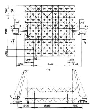 узловым элементам. 4.15. Плотность примыкания шестигранной муфты к поверхности узловых элементов проверяют щупом толщиной 0,1 мм, который не должен входить в глубину опорной поверхности. 4.16. Категорически запрещается приварка шестигранных муфт к узловым элементам и торцам стержней. 4.17. Перед подъемом укрупненного блока покрытия следует произвести контроль сборки и составить акт, разрешающий подъем и установку блока. 4.18. Допускается крепить профилированный настил дюбелями и с помощью сварки с соблюдением антикоррозионной защиты. 5. Подъем и установка конструкций покрытия5.1. Двумя кранами.5.1.1. Схема подъема и установки блока покрытия с помощью двух кранов показана на рис. 10. 5.1.2. Перед установкой стальных конструкций их опорные поверхности, а также поверхности примыкающих элементов необходимо очистить от грязи, ржавчины, масла, снега и т.д. Рис.10. Схема подъема и установки блока покрытия с помощью двух кранов: 1 - траверса; 2 - кран МКА-16 со стрелой 15 м 5.1.3. До подъема блоков в проектное положение колонны здания должны быть смонтированы и закреплены в соответствии с проектом. 5.1.4. Проектное положение стальной колонны достигается совмещением рисок на ее нижнем торце с рисками закладных деталей фундамента. 5.1.5. Расстрапливать стальную колонну можно только после ее закрепления анкерными болтами. 5.1.6. Отклонение конструкций стальных колонн от проектного положения должно не превышать следующих значений, мм:
