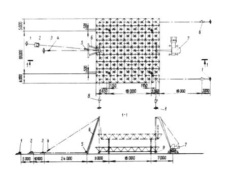 тяговым усилием 30 кН; 2 - тяговый канат; 3 - блок покрытия; 4 - оттяжка; 5 -