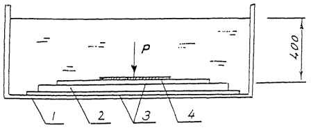 Схема испытаний стеклопакетов на герметичность 1 - емкость; 2 - образец стеклопакета; 3 - подкладка из твердой резины; 4 - стальная пластина 200´300 мм РИС. 3