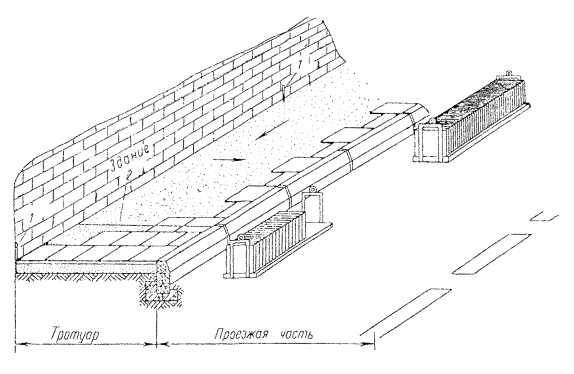обеспечивать проезд построечного транспорта. 1.6. Стадийность строительства дорог: магистральные и жилые улицы, временные дороги и часть специально запроектированных постоянных дорог на 1 стадии используют для проезда построечного транспорта и тяжелых строительных машин в процессе проведения работ по инженерному благоустройству и застройке района; по окончании застройки временные дороги демонтируют. На 2-й стадии, после окончания всех строительных работ по возведению зданий, постоянные внутриквартальные дороги используют для пропуска транспорта, обслуживающего жителей района. 1.7. На первой стадии работ устраивают: - водостоки и инженерные коммуникации; - вертикальную планировку; - земляное полотно; - подстилающий слой из песка или других материалов; - технологический и конструктивный слои; - основание из уплотняемых щебеночных смесей; - основания из монолитного бетона или сборных железобетонных плит, которые в период застройки района (за исключением основания из бетона марки 200) служат покрытием; - асфальтобетонное покрытие (нижний слой трехслойного покрытия), укладываемое на цементобетонное основание марки М200 (рис. 1.1); - грунтовые обочины шириной не менее 1 м; - организованные въезды на проезжую часть из железобетонных плит, уложенных заподлицо с поверхностью покрытия. 1.8. Вторая стадия включает: - очистку и ремонт основания (покрытия); - установку бортовых камней; - устройство прослойки толщиной 4 - 5 см из мелкозернистого щебня или крупнозернистого песка; - устройство верхних слоев покрытия из асфальтобетона или бетона; - строительство тротуаров; - оборудование улиц знаками и линиями регулирования движения транспорта и пешеходов. По окончании застройки района временные дороги из железобетонных плит должны демонтироваться и использоваться повторно на других объектах. Непосредственно перед сдачей объектов в эксплуатацию на территориях детских садов, школ, больниц, жилых зданий устраиваются постоянные дороги (рис. 1.2).