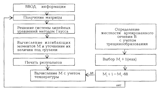 БЛОК-СХЕМА ОПРЕДЕЛЕНИЯ ИЗГИБАЮЩИХ МОМЕНТОВ В ПЛИТАХ ЖЕСТКИХ ПОКРЫТИЙ ОТ СОВМЕСТНОГО ВОЗДЕЙСТВИЯ АВТОМОБИЛЬНОЙ НАГРУЗКИ И ТЕМПЕРАТУРЫ.Наряду с широко применяемыми приближенными методами определения в плитах величин расчетных усилий, которые сводятся в основном к определению изгибающих моментов под грузом, приложенным в центре или на краю плиты, как показали проведенные в НИИМосстрое исследования, хорошие результаты дает расчет, основанный на применении метода конечных разностей и винклеровского упругого основания с использованием ЭВМ*). Данный метод позволяет рассчитывать плиты любой конфигурации жесткости (в том числе с учетом трещинообразования) и размеров на упругом основании с одним коэффициентом постели от любых произвольно приложенных одиночных или комбинированных нагрузок с учетом кручения и соблюдением всех граничных условий. Методика такого расчета реализована для ЭВМ на языке «Фортран» по следующей блок-схеме. *) Городецкий Л. В, Расчет бетонных конструкций