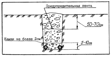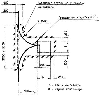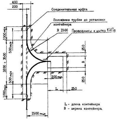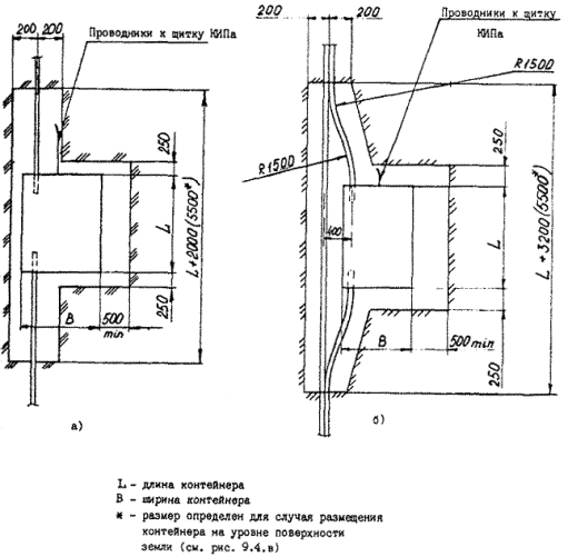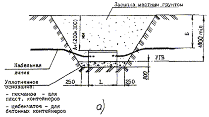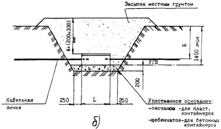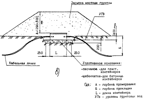 - в грунтах с уровнем грунтовых вод менее 1,4 м 9.3.4 Располагать контейнеры на особо неустойчивых грунтах (болотах, трясинах) и на низменных заливных местах допускается при условии укрепления основания и выполнения ограждающей обваловки, структура и объем которой определяются строительным проектом. 9.3.5 В скальных грунтах контейнеры могут размещаться по уровню прокладки кабельной линии. 9.3.6 В местах, где не исключена вероятность подъема контейнера под воздействием воды или промерзания грунта, должны применяться контейнеры с дренажными отверстиями в основании и засыпкой внутреннего пространства песком. 9.3.7 Параллельные действующие или резервные кабелеводы, с целью отвода их из зоны откопки в случае проведения ремонтных работ в муфте, должны, преимущественно, располагаться вне контейнера со стороны ввода в контейнер кабельной линии (см. рис. 9.1. б). 9.4. Монтаж контейнеров9.4.1 Монтаж контейнера должен производиться в соответствии с предписаниями его изготовителя. 9.4.2 При применении контейнеров разборного типа рекомендуются исполнение следующих технологических операций: 9.4.2.1 Контейнеры должны устанавливаться на уплотненный дренажный слой высотой 0,2 ... 0,3 м: песчаный - под пластмассовые контейнеры; мелкофракционный гравийный или щебенчатый - под контейнеры из бетона или аналогичных стройматериалов. 9.4.2.2 С целью защиты внутреннего объема от вымывания грунтовыми протоками корпуса контейнеров по периметру должны плотно обкладываться глинистым грунтом толщиной не менее 0,1 м. 9.4.2.3 Вводимые трубки должны быть укорочены до заданного документацией расположения внутри контейнера и заглушены соответствующими наконечниками. 9.4.2.4 При устройстве КИПа в контейнер должно быть введено нужное количество проводников и снаружи привязаны к одной из трубок кабелеводов. 9.4.2.6 После укладки запаса кабеля его следует засыпать слоем песка, затем уложить муфту, заполнить контейнер песком до верхнего уровня и закрыть плитами. Примеры укладок приведены на рис. 9.5.
