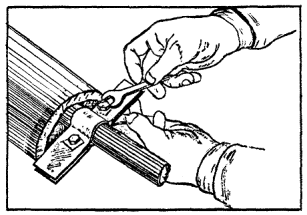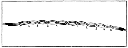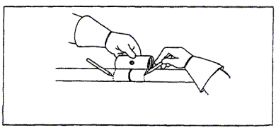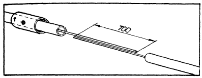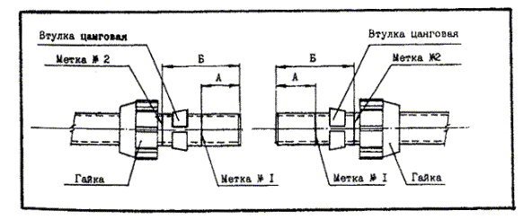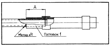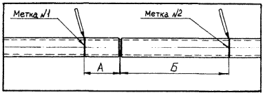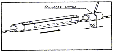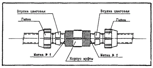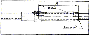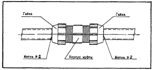 трубок 8.2.2 Монтаж пластмассовой муфты следует производить в следующей последовательности: 8.2.2.1 На подготовленные концы стыкуемых трубок надеть по гайке, разрезанной цанговой втулке и нанести графическим методом кольцевые метки: (см. рис. 8.3) - метку №1 - на расстоянии "А" от торца каждой трубки (см. рис. 8.1, рис. 8.2) - метку №2 - на расстоянии "Б" от торца каждой трубки (см. рис. 8.1, рис. 8.2) Например, для муфты типа "PLASSON" Æ 40 мм - А=53 мм; Б= 105 мм Рис. 8.3 8.2.2.2 На одну из соединяемых трубок надвинуть корпус муфты до упора, при этом кольцевая метка №1 должна занять положение у торца корпуса муфты (См. рис. 8.4). Для облегчения ввода следует смочить окончание трубки водой. Рис. 8.4 8.2.2.3 Удерживая корпус муфты прижатым к торцу трубки, надвинуть разрезную цанговую втулку и гайку до упора к корпусу муфты, при этом кольцевая метка №2 должна занять положение у торца гайки. (См. рис. 8.5) Рис. 8.5 8.2.2.4 Закрутить гайку на корпус муфты предварительно - с максимальным усилием руки, а затем окончательно - с помощью двух специальных одинаковых ключей (см. "Перечень инструментов ..." раздел 3, подраздел 3.8 настоящей инструкции). с максимальным усилием без применения дополнительных технических средств. (См. рис. 8.6). Рис. 8.6 8.2.2.5 Встречный конец трубки вставить в корпус муфты до упора, проконтролировать положение кольцевой метки №1, надвинуть разрезанную цанговую втулку и гайку, проконтролировать положение кольцевой метки №2 и произвести затяжку гайки предварительно, а затем окончательно с помощью двух специальных одинаковых ключей. 8.3 Соединение трубок с помощью металлических муфт8.3.1 Общие сведения 8.3.1.1 Металлическая муфта (см. "Перечень инструментов ..." раздел 3, подраздел 3.8 и рис. 8.7) представляет собой тонкостенную трубку с правой и левой симметрично расположенной внутренней резьбой. Такая конструкция позволяет затягивать концы стыкующих трубок в муфту простым вращением в одном направлении. Рис. 8.7 а) - применение поверх муфты термоусаживаемой трубки; б) - применение клеющих лент ВМ ТЕМФЛЕКС (88Т) и структурной ленты АРМОКАСТ. 8.3.1.3 Вводить кабель методом задува в кабелевод, имеющий хотя бы одну металлическую муфту, нельзя ввиду того, что данное соединение не обеспечивает герметичность при давлении внутри до 2,5 МПа. В связи с этим наиболее рационально применять металлические муфты для соединения трубок, содержащих внутри тяговый трос (линь), предназначенный для протаскивания кабеля. 8.3.1.4 Способ прокладки трубок, соединенных металлическими муфтами, должен исключать повреждение оболочки, обеспечивающей герметичность соединения. 8.3.2 Монтаж металлической муфты необходимо выполнять в следующей последовательности: 8.3.2.1 Перед соединением, на подготовленные концы стыкуемых трубок нанести графическим способом метки, определяющие расстояние, на которое должна навинчиваться муфта (см. рис. 8.8) Рис. 8.8 8.3.2.2 На одну из трубок надеть термоусаживаемый рукав, в случае его использования для герметизации. 8.3.2.3 Произвести сращивание тягового троса, расположенного внутри стыкуемых трубок, предварительно надев муфту на один из сращиваемых концов. Сращивание производить в следующей последовательности: а) Аккуратно отрезать концы острым ножом, оставив как минимум 700 мм перекрытия. (См. рис. 8.9) Рис. 8.9 б) Используя шило для прокола тяговых тросиков (см. "Перечень инструментов ..." раздел 3, подраздел 3,