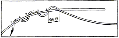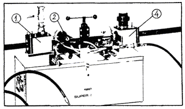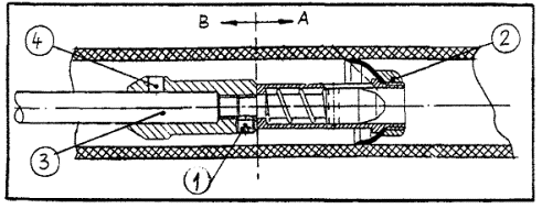 Давление в гидросистеме - 6,0 МПа; Габаритные размеры, мм - 550´330´600; Полная масса - 65 кг. (При заказе следует оговаривать встраивание влагоотделителя и охладителя воздуха). Рис. 12.6 Рис. 12.7 12.6.7 Все кабелевводные устройства допускают работу в поточнокаскадном процессе ввода кабеля и могут устанавливаться в разрыв линии в колодце или котловане. Схема установки кабелевводных устройств в каскад показана на рис 12.8. 12.6.8 Установка кабелевводных устройств "CABLEJET/SUPERJET" в промежуточных пунктах кабелевода возможна в двух вариантах: а) прямоточно в разрыв кабелевода, т.е. когда концы трубок закрепляются на входе и выходе кабелевводного устройства №2. (См. рис. 12.8, место 2). В этом варианте кабелевод должен иметь разрыв длиной: 370 мм - при применении "CABLEJET" и 730 мм - при применении "SUPERJET". По окончании прокладки этот разрыв кабелевода надо восстановить одним из способов с помощью ремонтных трубок (см. п.п. 8.6 настоящей инструкции). Следует помнить, что для последующей замены кабеля методом задувки это соединение непригодно и должно быть удалено, а это место 2 использовано для промежуточного ввода кабеля аналогичным способом; б) в разрез кабелевода (но без участка разрыва) с технологическим витком (см. рис. 12.8, место 3), т.е. когда в кабелевводном устройстве №3 закрепляется только конец трубки, куда вводится кабель, а выходной конец с подающего участка трассы укладывается рядом и поступающий кабель витком пропускается в кабелевводное устройство. При этом на выходном конце должна быть закреплена пластмассовая муфта и патрубок (см. п. 12.1.10 настоящей инструкции). Конец трубки должен быть отведен или расположен так, чтобы вылетающий из него поток воздуха не попадал на персонал. Технологический виток кабеля должен быть достаточным, чтобы вовремя реагировать на изменение скорости подачи кабеля от предыдущего "CABLEJET/SUPERJET" и успевать вручную регулировать темп его посыла в последующий пролет. Вместе с тем, виток никогда не должен быть меньше допустимого диаметра изгиба кабеля. После окончания процесса подачи кабеля от предыдущего устройства виток следует свести к допустимому минимуму, прекратить прокладку, разобрать кабелевводное устройство и освободить кабелевод, на выходном конце разрезать и удалить патрубок, излишки кабеля протолкнуть в кабелевод и соединить концы трубок пластмассовой муфтой (см. п. 8.2 настоящей инструкции). 12.6.9 Дополнительные устройства и принадлежности, предлагаемые торговой фирмой "РLUMEТТ" для ввода ОК в ПВП кабелеводы методом "CABLEJET". 12.6.9.1 Кабеленаправляющий наконечник SH ("SONIC HEAD") рекомендуется к применению в качестве направляющего устройства при следующих условиях: · Вводимый кабель имеет низкую жесткость (мягкий кабель) по своей конструкции или вследствие воздействия высокой температуры воздуха; · Диспропорция между диаметром канала и диаметром кабеля (тонкий кабель в большой трубке). Наконечник "SH", приведенный на рис. 12.9, выполнен из 2-х частей: часть "А" - пневморегулирующее устройство; часть "В" - кабелезакрепляющее устройство. Рис. 12.9 Перед установкой наконечника следует убедиться, что он соответствует диаметру трубки и диаметру кабеля. Проверить затяжку винтов 1 и гайки 2 и закрепить кабель 3 тремя винтами 4. Принцип действия наконечника "SH" объясняется следующим образом. При вводе кабеля методом "CABLEJET" без наконечника воздушный поток