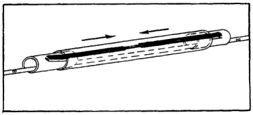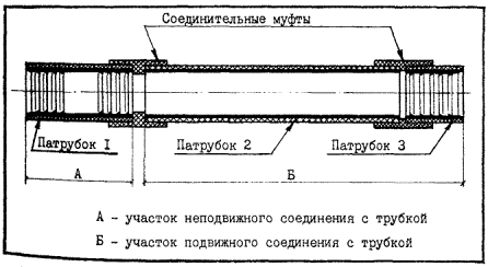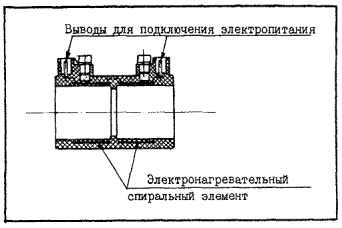 случае такое соединение будет испорчено. 8.3.2.7 Произвести герметизацию муфтового соединения одним из способов, указанным в п. 8.3.1.2 настоящей инструкции. 8.3.2.8 При герметизации соединения с применением термоусаживаемой трубки необходимо следовать инструкции ее изготовителя. Располагать термоусаживаемую трубку следует симметрично относительно середины муфты. С помощью источника тепла, например, паяльной лампы нагревать до тех пор, пока она не сожмется плотно вокруг металлической муфты. Нагрев производить от центра к концам трубки. После окончания процесса термоусадки необходимо дать соединению остыть в течение приблизительно десяти минут. 8.3.2.9 При герметизации соединения с применением клеющих лент ВМ Темфлекс (88Т) и структурной ленты Армокаст необходимо пользоваться "Руководством по герметизации соединительных муфт, оболочек и шлангов кабелей связи с применением структурного материала "ARMORCAST", утвержденным Министерством связи России 31.01.1995 г. 8.4 Соединение трубок с помощью электросварных муфт8.4.1 Общие сведения 8.4.1.1 Метод соединения трубок электросварными муфтами на данном опытном этапе рассматривается как рекомендательный и перспективный на дальнейшее. По мере расширения строительства ВОЛС с применением ПЭ трубок его внедрение может стать необходимым и экономически оправданным. 8.4.1.2 Метод соединения электросварными муфтами основан на разогрев однородных контактирующих материалов. Муфта, так же как и трубка, изготавливается из полиэтилена и представляет собой втулку, в которой в определенной зоне залит электронагревательный спиральный элемент с выводами для подключения электропитания. (См. рис. 8.15). Рис. 8.15 8.4.1.3 Сварка муфт производится с помощью электропреобразовательного аппарата с компьютерной программой выбора технологического режима процесса в зависимости от заданных типоразмеров свариваемых соединений (муфт) и наружной температуры. Питание аппарата осуществляется от сети или автономного источника питания как правило, бензоагрегатного генератора переносного типа. 8.4.1.4 Технологическая подготовка и процесс монтажа должны выполняться в строгом соответствии с указаниями изготовителя электросварных муфт и сварочного аппарата. 8.5 Соединение трубок с помощью компенсирующих муфт "ELOC".8.5.1 Муфта "ELOC" (см. "Перечень инструментов ... " раздел 3, подраздел 3.8) применяется для соединения трубок на участках трассы (например, на мостах), подверженных влиянию перепадов температуры в большом диапазоне и вызывающих удлинение - сжатие ПВП кабелевода. 8.5.2 Муфта "ELOC" представляет собой трубу, состоящую из трех патрубков, соединенных между собой муфтами. Каждый патрубок изготовлен из ПВХ с внутренней поверхностью из полиэтилена. (См. рис. 8.16). Рис. 8.16 Патрубок 1 обеспечивает на участке "А" неподвижное, герметичное соединение с введенной трубкой. Патрубки 2 и 3 образуют участок "Б", на котором введенная трубка имеет подвижное герметичное соединение. Патрубок 2 является направляющим для введенной трубки, а патрубок 3 - уплотнительным, обеспечивающим герметизацию ввода. 8.5.3 Монтаж муфты "ELOC" следует производить в следующей последовательности: 8.5.3.1 Отрезать трубки в месте их взаимного перекрытия и обработать кромки торцов трубок специальным инструментом для снятия фасок. Концевые участки трубок следует тщательно очистить на всей 