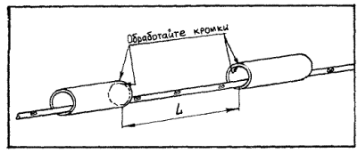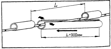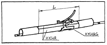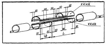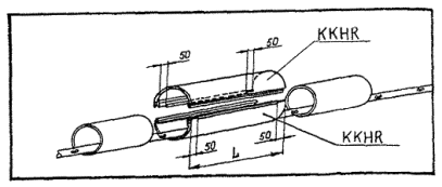 прямое воздействие на муфту металлическим молотком без деревянной прокладки. 8.5.3.4 Ввести трубку с меткой №2 в патрубок 2 муфты "ELOC" до упора, этом кольцевая метка должна занять положение у торца муфты. (См. рис. 8.19) Рис. 8.19 8.6 Соединение трубок с кабелем внутри8.6.1 Соединение ПВП кабелеводов с помощью ремонтной трубки KKHR и муфт KKHRM фирмы "THYSSEN", Германия (см. "Перечень ...." раздел 3, подраздел 3.8 настоящей инструкции). 8.6.1.1 Такое соединение может быть использовано: а) после выполнения задувки кабеля кабелевводными устройствами, установленными в промежуточных пунктах в разрыв кабелевода (см. п. 12.6.8.а настоящей инструкции) с целью восстановления технологического промежутка, если не удается компенсировать этот промежуток, например, с помощью придания трубкам на период задувки криволинейной траектории; б) после разрыва и появления промежутка вследствие продольной усадки кабелевода; в) после удаления участка кабелевода с повреждениями. 8.6.1.2 Ремонтная трубка KKHR фирмы "THYSSEN" представляет собой две однометровые одинаковые половинки трубки из ПВХ, имеющие продольные профили в виде выступа "елочка" с одной стороны и канавки с резиновыми уплотнениями с другой стороны. На время поставки ремонтной трубки канавки с резиновыми уплотнениями закрыты самоклеющейся пленкой. 8.6.1.3 Муфта KKHRM состоит из двух полукруглых половинок с резиновыми внутренними обкладками и двух клиновых задвижек. В комплект муфты придается упаковка с герметиком в виде жгутиков. 8.6.1.4 Потребность однометровых ремонтных трубок KKHR определяется длиной поврежденного (вставляемого) участка кабелевода. 8.6.1.5 Потребность муфт KKHRM определяется количеством поперечных стыков (см. п. 8.6.1.7 подпункт и)). 8.6.1.6 Наружный диаметр ремонтной трубки KKHR должен совпадать с наружным диаметром кабелевода. а) вырезать и удалить поврежденный участок "L" ПВП трубки кабелевода (см. рис. 8.20), используя телескопический резак и инструмент для продольной резки трубок (см. "Перечень ...", раздел 3 подраздел 3.8 настоящей инструкции); Рис. 8.20 б) обследовать кабель на вскрытом участке и в случае непригодности его к дальнейшей эксплуатации следует выполнить ремонт согласно п. 15.3 настоящей инструкции; в) притупить напильником кромки торцев ПВП трубки осторожно, чтобы не повредить кабель. (См. рис. 8.21); Рис. 8.21 г) измерить фактическое расстояние "L" между торцами трубок кабелевода и заготовить ремонтную трубку такой же длины (при длине вставки £1 м). (См. рис. 8.21); д) снять защитную пленку на концах каждой половинки трубки KKHR на длине 50 мм и заполнить канавку герметиком. (см. рис. 8.22); Рис. 8.22 е) замкнуть между собой две половинки трубок KKHR с помощью обжимного инструмента KKHRG (См. рис. 8.23). Такое соединение обеспечивает герметичность продольного стыка; Рис. 8.23 ж) установить на каждый стык между трубкой и вставкой две половинки муфты и стянуть между собой клиновыми задвижками, забиваемыми молотком. При установке муфты ее продольный стык должен быть повернут на угол 60° относительно продольного стыка ремонтной трубки KKHR. (См. рис. 8.24). Такое муфтовое соединение образует герметичность поперечного стыка; Рис. 8.24 и) при вставке более протяженной, чем поставляемая длина ремонтной трубки, стыки полутрубок следует чередовать как показано на рис. 8.25. Снятие защитной пленки и заполнение канавок на длине 50 мм производить у каждого поперечного стык