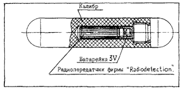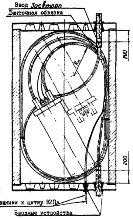 Рис. 9.5 Укладка оптической муфты а) - в контейнере, установленном в разрыв кабелевода б) - в контейнер с отводом в сторону от кабелевода Rk - минимально допустимый радиус изгиба кабеля 9.4.2.7 Поверх плит следует уложить два слоя рубероида с загибом их по периметру. На него поместить маркер и засыпать контейнер и трубки мягким грунтом. На расстоянии 0,3 ... 0,4 м от верха контейнера, над ним и трубками следует поместить предупредительную ленту и произвести окончательную засыпку котлована. 10. Проверка качества прокладки и монтажа кабелеводов перед вводом кабеля10.1 Общие указания10.1.1 Все участки кабелеводов, смонтированные из трубок, проложенных в грунт или протянутых в каналах кабельной канализации, перед вводом в них кабеля должны быть подвергнуты контрольным проверкам: - на отсутствие загрязнения канала (прочистка); - на проходимость (калибровка); - на герметичность. 10.1.2 Все проверки являются регламентными и актируются (протоколируются) перед прокладкой кабеля в присутствии заказчика. 10.1.3 Проверки могут проводиться либо на полностью смонтированном строительном пролете кабелевода между контейнерами оптических муфт, либо по участкам внутри пролета, разбивка на которые произведена с учетом запланированной последующей установки промежуточных механизмов для ввода кабеля. 10.1.4 К проверкам следует приступать только после завершения основного объема линейных засыпных работ на сдаваемых участках, за исключением котлованов под контейнерные устройства и промежуточные пункты ввода кабеля. Выполнение этого требования должно быть освидетельствовано и вносится в протоколы всех проверок. 10.1.5 По окончании любой проверки концы трубок должны закрываться герметичными концевыми заглушками. 10.1.6 Результаты проверок кабелевода должны быть оформлены протоколом, на основании которого должен быть составлен акт сдачи участков для ввода кабеля. (См. приложение 3). 10.1.7 Резервные трубки, проложенные по всей трассе, должны быть подвергнуты по участкам прочистке, проверке на проходимость, соединены муфтами в единую линию между соседними усилительными и между усилительными и станционными пунктами и проверены на герметичность. После получения положительных результатов трубки следует оставить под испытательным давлением и после оформления протокола и акта сдать заказчику. Резервные трубки, проложенные только на отдельных участках, например, через водные преграды должны пройти также полный объем проверок и плотно закрыты концевыми заглушками "PLASSON" или "SPUR" и после оформления документов сданы заказчику. 10.2 Проверка на отсутствие загрязнения, препятствий, воды и одновременно прочистка канала проводится первоначально продувкой его воздушным стоком от компрессора с максимальной подачей воздуха, а затем прогоном сквозь канал губчатого цилиндра. Цилиндр должен быть изготовлен из мягкого полиуретана (поролона) мутностью 30 - 40 кг/м3 и иметь диаметр в два раза больше, чем внутренний диаметр трубки, обеспечивая этим достаточное уплотнение. Длина цилиндра должна быть 100...150 мм. Для определения мест негерметичности в канале скорость перемещения цилиндра должна быть не выше 80 м/мин. Качество прочистки определяется визуальным наблюдением за выходным отверстием канала и загрязнением цилиндра. При большом объеме вытесненной воды следует определить причину и