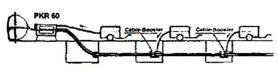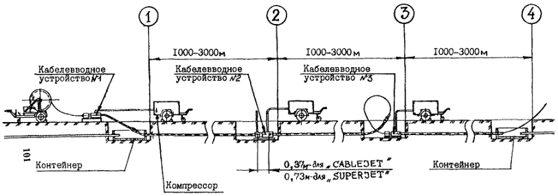 Рис. 12.5.1 Рис. 12.5.2 12.5.8 Для задувки второго кабеля в занятый канал кабелевода рекомендуется использовать Y - соединитель. (См. рис. 12.5.3). Размеры Y - соединителя - 300´90´180 мм, масса - около 9 кг, максимальный наружный диаметр трубки кабелевода - 60 мм. Y - соединитель работает только в комплексе с кабелевводным устройством PKR-60 или "FIBERCAT" (см. рис. 12.5.4). Для задувки применяется специальный поршень. Рис. 12.5.3 Рис. 12.5.4 12.5.9 Длина ввода оптического кабеля в ПВП кабелеводы поршневым методом находится в такой же степени зависимости от факторов, подробно приведенных в п. 12.6.10 настоящей инструкции. 12.5.10 При выполнении задувки поршневым методом рекомендуется придерживаться следующих технических правил: 12.5.10.1 Поршень должен быть несколько меньшим, чем диаметр канала, в этом случае будет исключаться потери на трение поршня о стенки канала, а воздушный поток будет иметь скорость большую, чем скорость кабеля и создаст дополнительные тяговые силы, в определенной мере свойственные беспоршневой технологии задувки. 12.5.10.2 Между поршнем и кабельным чулком, надетым на кабель, следует встраивать радиозонд для определения места застревания, в случае непредвиденной остановки кабеля, при его вводе в кабелевод. 12.5.10.3 Оконцевание кабеля должно производиться с помощью кабельного наконечника либо кабельного чулка в соответствии с указаниями п. 12.4.8. 12.5.11 При поршневом методе ввода кабеля следует четко сопоставлять допускаемую растягивающую нагрузку с величиной тягового усилия, развиваемого поршнем. Тяговое усилие считается по формуле: Рт = 0,1 (Sкан. - Sкаб.)×(Ркомп.-1), где Рт - тяговое усилие, кН; Sкан. - площадь канала кабелевода, см2; Sкаб. - площадь сечения вводимого кабеля, см2; Ркомп. - максимальное давление компрессора, МПа. Тяговое усилие не должно превышать допустимую нагрузку на кабель. Например: при поршневом вводе кабеля Æ 14 мм в канал Æ 33 мм сила затягивания при давлении в 1,0 МПа будет равна 0,716 кН. Вводимый кабель должен допускать эту растягивающую безопасную нагрузку. 12.5.12 При ведении процесса прокладки поршневым методом, кабель с барабана должен подаваться свободно, без натяжения. Не следует допускать размотку барабана кабелевводным устройством. 12.5.13 При использовании кабелевводных с механической подачей кабеля устройств (например, типа PKR-60 или "FIBERCAT", а также "CABLEJET" или "SUPERJET") возможны следующие технические варианты задувки кабеля: а) при наличии компрессора с выходными параметрами по производительности Q » 10 м3/мин и давлению до 1,2 МПа (12 кг/см2) задувка кабелей с массой 0,1...0,3 кг/пог.м. в каналы диаметром до 40 мм можно проводить как беспоршневым так и поршневым методом; б) при таком же компрессоре, как в пункте "а", задувку в каналы с диаметром более 40 мм или задувку кабелей выше 0,3 кг/пог.м. целесообразно проводить поршневым методом; в) при компрессоре с давлением до 0,7 МПа (7 кг/см2) и производительностью Q » 8 м3/мин задувку в каналы диаметром до 40 мм целесообразно также вести поршневым методом; г) при наличии компрессоров малой производительности в целях достижения необходимой потребности в воздушном потоке рекомендуется соединить их параллельно. 12.6 Беспоршневой метод задувки кабеля (метод "CABLEJET")12.6.1 Этот современный метод основан на принципе поддержания вводимого кабеля во взвешенном (динамическом) состоянии при продвижении его в кабелеводе за счет интенсивного (тур
