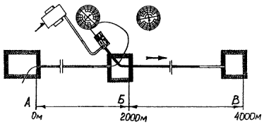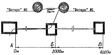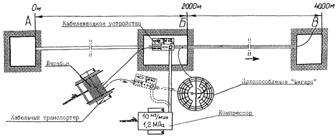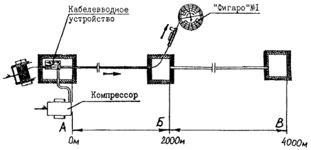 на "Фигаро" №2 в) Задувка кабеля от Б к В из "Фигаро"№2 Рис. 12.12 Использование приспособлений "Фигаро" при задувке кабеля от начала участка ввода.