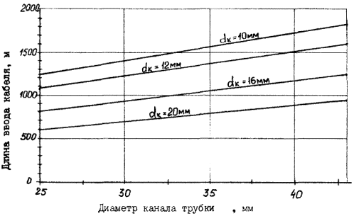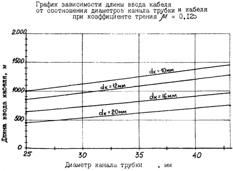 определения местонахождения дефекта трубки Представляет собой калибр, оснащенный радиопередатчиком (см. рис. 10.1). Прогоняется воздухом через трубку и при его остановке в зоне дефекта отыскивается с поверхности земли с помощью портативного зонда радиосигналов, например фирмы "ЗМ" или "LANCIER". (См. рис. 10.2). 12.6.10 На длину ввода оптического кабеля в ПВП кабелеводы "методом САВLEJET" оказывают влияние следующие факторы: · соотношение диаметра кабеля и диаметра канала кабелевода (см. п.12.6.11); · масса кабеля (см. п. 12.6.12); · коэффициент трения между кабелем и каналом (см. п. 12.6.13). · жесткость кабеля (см. п. 12.6.14); · температура окружающей среды (см. п. 12.1.5); · уклоны трассы (см. п. 12.1.8); · искривления и повороты трассы в плане; · вертикальные перепады в рельефе местности; · искривления ("волнистости") трубок (каналов) в среде заложения; · параметры компрессора (см. табл. 12.1); · использование направляющего наконечника (см. п. 12.6.9.1) или поршня. 12.6.11 При выборе соотношения диаметра кабеля и диаметра канала кабелевода следует руководствоваться данными по предельному диаметру кабеля для каждого типоразмера трубки, приведенными в табл. 3.6 настоящей инструкции. Техническое правило соотношения диаметров гласит: чем меньше диаметр кабеля, тем легче кабель проходит искривления кабелевода и вводится дальше. Определено, что наилучшее рациональное с точки зрения использования объема канала соотношение тогда, когда диаметр кабеля составляет чуть меньше половины диаметра канала. При необходимости ввода кабеля больших размеров протяженность прокладки с одной технической установки резко сокращается. 12.6.13 Для протяженной прокладки, независимо от технического способа ввода кабеля, важно, чтобы трение между материалами трубки или кабеля было минимальным. На рис. 12.7 и рис. 12.18 приведены графики, предложенные фирмой "PLUMETT" и отражающие закономерность влияния трения на длину прокладки при определенных соотношениях диаметров "D" каналов и диаметров "d" кабеля. Фактически эта зависимость почти пропорциональна. Применительно к трубкам "SILICORE", обеспечивающих более низкий коэффициент трения, чем указано на графиках, длина ввода кабеля в них будет соответственно больше. К сведению: приведенные данные на графиках не следует принимать как предельные, так как графики дают только сопоставление трех факторов для метода "CABLEJET" на определенной трассе ("волнистость" трубки < 15 см с периодом > 6 м и радиусом изгиба > 1 м). 12.6.15 В зависимости от сочетания упомянутых в п. 12.6.10 настоящей инструкции факторов, длина задувки с помощью одной технической установки может составлять от 700 до 2000 м и даже больше. Первоначально рекомендуется определить достижимую исходную дистанцию ввода кабеля на основе первых четырех главных параметров, приведенных в п. 12.6.10 и в дальнейшем корректировать ее применительно к реальной трассе. График зависимости длины ввода кабеля от соотношения диаметров канала трубки и кабеля при коэффициенте трения m =0,1