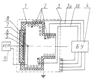 начала испытания, мин; Т - температура в печи, соответствующая времени t, °С. 3. ОБОРУДОВАНИЕ ДЛЯ ИСПЫТАНИЯ3.1. Установка, предназначенная для определения теплоизолирующих свойств покрытий по металлу (рис. 1), включает в себя: - испытательную печь с кожухом 1; - блок управления режимом нагрева 4; - блок держателя образца 8; - прибор, регистрирующий температуру 9. Рис. 1. Схема установки для определения