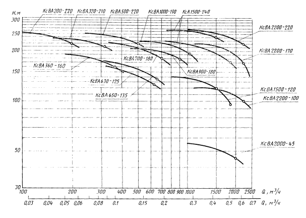 напорного патрубков. (Измененная редакция, Изм. № 2). Пример условного обозначения центробежного конденсатного насоса в горизонтальном исполнении для АЭС с подачей 0,417 м3/с (1500 м3/ч) и напором 240 м: Насос КсА 1500-240 ГОСТ 24465-80 То же, в вертикальном исполнении с подачей 0,139 м3/с (500 м3/ч) и напором 220 м: Насос КсВА 500-220 ГОСТ 24465-80 При модернизации насосов (или совершенствовании конструкции без изменения подачи и напора) в обозначение насоса через тире следует вводить цифры, указывающие порядковый номер модернизации по системе нумерации предприятия-изготовителя. Рабочие части характеристик Q - Н