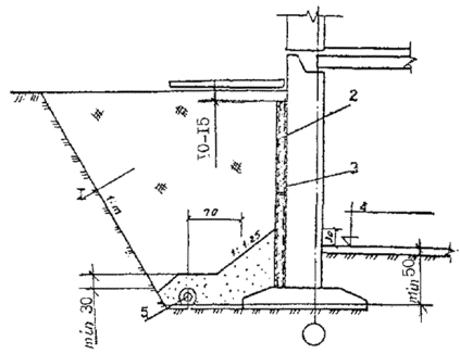 2.4. Материалы, применяемые для изготовления плит, должны отвечать требованиям следующих ГОСТов и ТУ: Цемент - ГОСТ 10178-85* Керамзитовый гравий и песок - ГОСТ 9757-90 Плотные заполнители - ГОСТ 8268-82* - ГОСТ 10260-82* - ГОСТ 8267-82* Полистирол вспенивающийся, суспензионный с поверхностной обработкой - ТУ 6-05-1905-81 2.5. Марка цемента должна быть не ниже 400. 2.6. Марка керамзитового гравия должна быть не ниже 500, фракции керамзита от 0,1 до 10 мм. 2.7. Размер частиц плотного заполнителя должен быть 3-10 мм. 2.8. Следует применять полистирол марки ПСВ-75С или ПСВ-76С. 2.9. Состав керамзитобетона - 1:2,5; 1:3 (по массе). Водоцементное соотношение в зависимости от влажности применяемого керамзита принимается равным от 0,45 до 0,7. 2.10. Состав пористого бетона на плотных заполнителях (по массе) 1:6; 1:7; 1:8. Водоцементное соотношение - от 0,35 до 0,46 в зависимости от влажности заполнителя. 2.11. Отпускная прочность бетона плит в момент отгрузки должна быть не менее 4,5 МПа. 2.12. Прочность на сжатие пенополистирольных плит при 10% линейной деформации - не менее 0,03 МПа. 2.13. Плотность пенополистирольных плит должна составлять 18- 20 кг/м3. 2.14. Коэффициент фильтрации плит составляет: - из пористого бетона и керамзитобетона от 350 до 500 с/сут. - из пенополистирола - не менее 500 м/сут. 3. ПРАВИЛА УКЛАДКИ ФИЛЬТРУЮЩИХ ПЛИТ3.1. Укладка фильтрующих плит производится в соответствии с проектом, определяющим конструкцию дренажного сооружения, и проектом производства работ. 3.2. Укладка плит пристенного дренажа производится совместно с устройством сопутствующего трубчатого дренажа, в зависимости от расчетного уровня грунтовых вод по отношению к полу подвала сооружения: - если расчетный уровень грунтовых вод расположен ниже пола подвала сооружения дренаж выполняется из вертикально установленных у стены фильтрующих плит и сопутствующего трубчатого дренажа, засыпаемых песком с коэффициентом фильтрации 5 м/сут на высоту не менее 30 см над трубчатым дренажом (рис. 2, 3); - если расчетный уровень грунтовых вод расположен выше пола подвала сооружения, дренаж выполняется с дополнительной прокладкой фильтрующих керамзитобетонных плит через 5-15 м (расстояние должно быть отражено в проекте) от стены сооружения до сопутствующего трубчатого дренажа с уклоном 0,2-0,5% (рис. 4) Возможно сочетание пристенного дренажа с пластовым (рис. 5, 6). 3.3. Установку первого снизу ряда плит следует производить на 30 см ниже пола подвала сооружения. Трубчатый дренаж устраивается ниже пола подвала не менее чем на 50 см. 3.4. Укладку плит пристенного дренажа производить в направлении от внутренних углов здания к внешним. Рис. 1 Конструктивная схема фильтрующей плиты ( к табл. 1) Рис. 2. Схема пристенного дренажа здания с сопутствующим дренажом: 1 - местный грунт; 2 - фильтрующие керамзитобетонные или