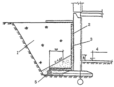 5 - фильтрующие плиты; 6 - обмазочная гидроизоляция; 7 - дренажная труба Рис. 4. Схема пристенного дренажа здания с