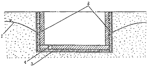 гидроизоляция по проекту; 4 - дренажный колодец; 5 - дренажная труба; 6 - канал