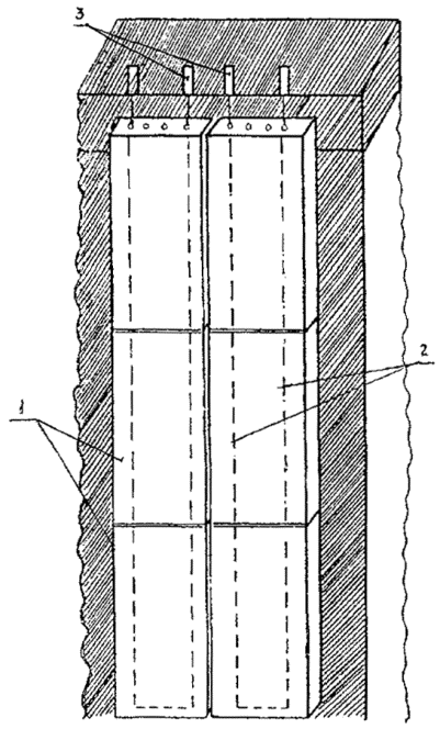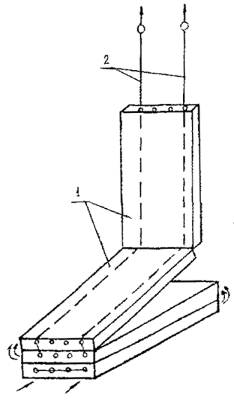 (синтетический) материал; 4 - колодец для откачки воды (вариант) 3.5. Верх фильтрующих плит должен располагаться на 10-15 см ниже планировочных отметок отмостки. 3.6. Отвод воды из плит пристенного дренажа в сопутствующий трубчатый дренаж производится по песчаному слою или по фильтрующим керамзитобетонным плитам. Песчаный слой должен иметь толщину не менее 30 см и состоять из песка с коэффициентом фильтрации не менее 5 м/сут. 3.7. Фильтрующие плиты для пристенных дренажей жилых зданий должны применяться в сочетании с обмазочной или рулонной гидроизоляцией, наносимой на защищаемые элементы сооружения. 3.8. Устройство пристенного дренажа из керамзитобетонных плит производится рядами снизу вверх с послойной обратной засыпкой. 3.9. Допускается применять механизированный способ монтажа с помощью крана и стального троса, пропущенного через отверстия в плитах (рис. 7). Навешивание гирлянд из плит на стену осуществляется путем крепления троса к выпускам арматуры или закладным деталям в верхней части стены (рис. 8). После выполнения обратной засыпки трос высвобождается с помощью крана и используется для монтажа следующей гирлянды. 3.10. Фильтрующие плиты приклеиваются к вертикальной поверхности подземной части зданий на битуме марок БН40/60, БН60/90 или битумными мастиками. 3.11. Рекомендуется приклеивать плиты ФППС всей поверхностью или по четырем углам плиты. 3.12. Битумы и битумные мастики наносятся на стену непосредственно перед приклеиванием плит. 3.13. Температура битума не должна превышать 90°С. 3.14. Перед монтажом фильтрующих плит контейнеры с плитами равномерно располагаются вдоль трассы дренажа. 3.15. При монтаже зазоры между плитами не должны превышать 2 см. 3.16. Допускается устройство пристенного дренажа из кусков плит ФППС. В этом случае допуск по швам между плитами необходимо соблюдать в соответствии с п.3.15. Рис. 7. Схема подъема плит, сложенных в штабель: 1 - керамзитобетонные фильтрующие плиты; 2 - стальной трос 0 4,8 мм Рис. 8. Схема