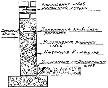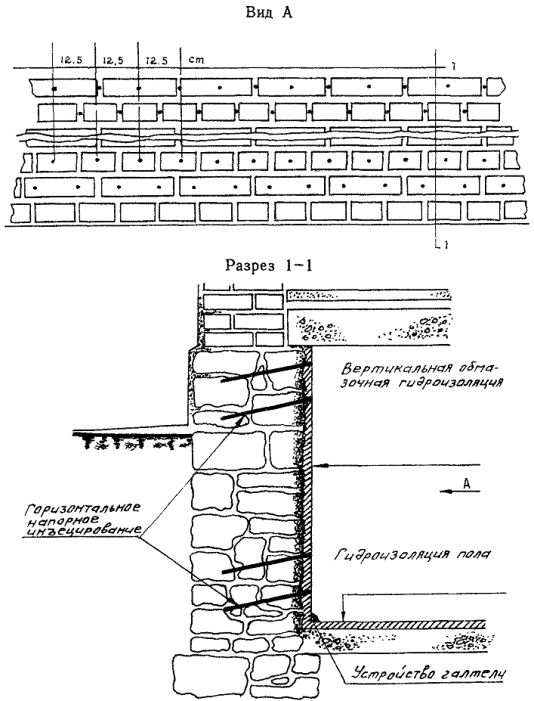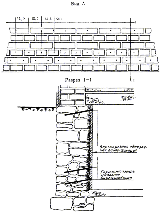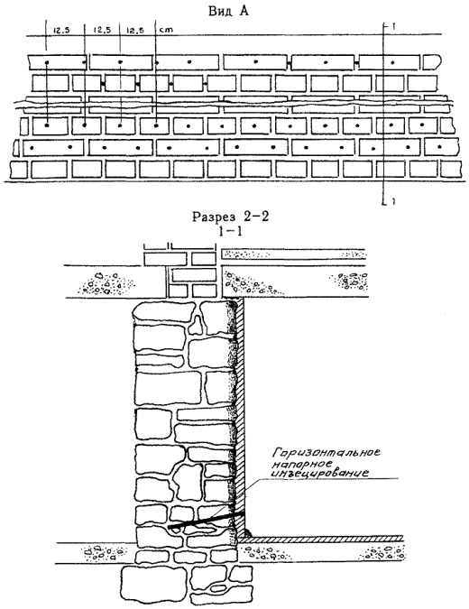 - готовится на рабочем месте в соответствии с ТУ 2312-008-04000633-96; - мало токсичен и пожароопасен до пропитки; - хранение: в стеклянной плотно закрытой таре по ГОСТ 9980.1-86* (срок хранения 1 год); - транспортирование при температуре не выше +30°С; - расход для инъекционной обработки на 1 шпур при 2-кратной заливке - 1 литр. 3.3.2. Инъекционный состав "Аквафин-Ф" фирмы "Шомбург":- готовый к применению раствор для силикатизации на основе гидрофобизирующих кремниевых соединений. При взаимодействии с известью образует нерастворимые, прекращающие капиллярный подсос химические соединения; - предназначен для прекращения капиллярного впитывания при работах по ремонту старых зданий; - гидрофобизирует и сужает или перекрывает капиллярную структуру в бетоне и каменной кладке; - не вызывает коррозии арматурной стали; - технические данные: основа - кремниевые соединения, жидкие; цвет - прозрачный; удельный вес - 1,2 г/см3; - хранение: в теплом помещении в закрытых емкостях. Срок хранения 1 год; - расход рассчитывается, исходя из впитывающей способности стены, по данным обработки пробного шпура. - для инъецирования необходимо устраивать шпуры длиной не менее 2/3 толщины стены; - при обработке стен толщиной более 1 м, а также в углах зданий следует располагать шпуры с обеих сторон. 3.3.3. Инъекционный состав "Аквафин-СМК":- концентрат силиконовой микроэмульсии, приготовленный на основе силанов и олигомерных силоксанов; - применяется для устройства горизонтальной гидроизоляции - заслона поднимающейся капиллярной влажности; - технические данные: основа - силан/силоксан; цвет - прозрачный; удельный вес - 0,95 г/см3. Срок хранения 9 месяцев, хранить в теплом помещении; - расход: 1,5 - 2 кг концентрата на 1 м2 площади поперечного сечения стены; - не содержит растворителей, без запаха, не горюч, безвреден для здоровья. 3.4. Составы, применяемые для инъекционной изоляции (полимерцементные).3.4.1. Быстросхватывающаяся уплотняющая смесь (БУС):- алюминатно-силикатное нетоксичное вяжущее; - свойства: самоуплотнение; интенсивное расширение; водонепроницаемость в зачеканенном состоянии; легкость комкования и хорошее зачеканивание. - технические данные: основа - глиноземистый расширяющийся цемент, портландцемент, глиноземистый цемент, асбест хризотиловый; цвет - серый; - водоцементное отношение цементного теста 0,28 - 0,32; - водонепроницаемость - через сутки должен быть водонепроницаемым; - расход: 2 кг/л пустот. 3.4.2. Состав Асокрет-БМ:- состоит из цемента и извести; - предназначен для заполнения полостей в каменных стенах, особенно при создании горизонтального заслона. - технические данные: основа - раствор, содержащий цемент; цвет - серый; плотность в сухом виде - 0,9 кг/дм3; плотность в сыром виде - 2 кг/дм3; - время работы с материалом - 1 час; - расход: 2 кг/л пустот. 3.5. Технология инъецирования.Принцип инъецирования состоит в следующем: - под давлением в конструкцию вводятся специально составленные растворы (ГУИ-412э, Аквафин-Ф, полимерцементные); - без давления (не менее 8 часов пропитки или под низким давлением вводятся составы ГУИ-412э, Аквафин-СМК, полимерцементные); - эти специальные составы обеспечивают водонепроницаемость, укрепляют и восстанавливают конструкцию; - после тщательного исследования определяют, какой вид применим к данной ситуации, и приступают к выбору материалов; - все работы по уплотнению и гидр