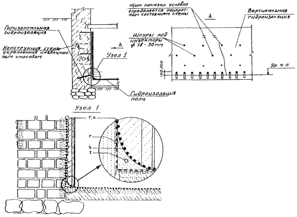 - гигроскопическое водопоглощение; 6 - конденсация Выполнение работ разрешено при следующих условиях: - температура наружного воздуха должна быть не ниже +5°С; - с наружной стороны стены должны быть отморожены не менее чем на половину их толщины, что достигается выдерживанием при устойчивой круглосуточной температуре +8°С в течение 5 суток подряд. Запрещается выполнение работ по покровной гидроизоляции: - в жаркую погоду при температуре воздуха в тени +27°С и при прямом воздействии солнечных лучей; - во время дождя и непосредственно после дождя по поверхности, не впитавшей воду; - при ветре, скорость которого превышает 10 м/сек. Гидроизоляцию внутренних поверхностей допускается производить в помещении при температуре не ниже 10°С и относительной влажности воздуха не более 80%. 2. ТЕХНОЛОГИЯ ПОДГОТОВКИ ПОВЕРХНОСТЕЙ ДЛЯ РАБОТ ПО ГИДРОЗАЩИТЕ И УКРЕПЛЕНИЮ КОНСТРУКЦИЙ2.1. Перед началом работ по гидрозащите и укреплению конструкций частей зданий и сооружений инъекционными и покровными способами необходимо: - тщательно осмотреть поверхность изолируемых конструкций; - расчистить все дефектные места (трещины, выбоины, несвязанные раствором места); - обрабатываемая поверхность должна быть чистой, прочной, очищенной от остатков мазута, гудрона, цементного раствора, масляных и жировых пятен, затиров от резины, затеков и т.д.; - по возможности поверхность следует обработать скребками или пескоструйным аппаратом; - обладающие впитывающими свойствами поверхности необходимо равномерно обильно смочить водой, избегая образования луж; - поврежденные места (сколы, раковины, трещины и т.д.) затирают полимерцеметным раствором из сухой смеси марки не ниже 75, затворяемой вяжущей эмульсией Асопласт-МЦ. (Асопласт-МЦ - синтетическая эмульсия на бутодиене и стироле - придает застывшему раствору повышенное сцепление, повышает эластичность и стойкость к размоканию, снижает водопроницаемость, увеличивает химическую стойкость). 2.2. В случае немедленной гидроизоляции увлажненных мест поверхностей, мест протекания и просачивания воды в подвалах, шахтах и т.д. используется уплотнительный цемент ФИКС-10с. 2.3. В случае необходимости устройства в наружных стенах здания горизонтальной гидроизоляции необходимо обеспечить доступ для установки инъекторов и инъецирования по всему периметру здания (снаружи и изнутри). 2.4. Русты и трещины в стенах и перекрытиях должны выполняться полимерцементным составом с применением сухой смеси с Асопластом-МЦ и последующим выравниванием. Места примыканий разнородных материалов необходимо проклеивать марлей на 50%-ной поливинилацетатной пластифицированной (содержащей дибутилфталат ГОСТ 18992-80) дисперсии, разбавленной водой 2:1 или клеем Унифлекс-Б. Марля должна быть тщательно разглажена, не иметь складок, вздутий и после высыхания клеевого слоя не отслаиваться от поверхности. 3. ТЕХНИЧЕСКИЕ ТРЕБОВАНИЯ К ИНЪЕКЦИОННЫМ ГИДРОИЗОЛЯЦИОННЫМ МАТЕРИАЛАМ3.1. Область применения:- для прекращения капиллярного впитывания путем создания горизонтального заслона при работах по ремонту старых зданий; - для ликвидации пустот и раковин; - для ликвидации неплотностей в бетоне, если имеются различного рода крепления (анкеры, консоли, выступающие опоры, гильзы и др.); - для замоноличивания пазух в подземных сооружениях, заполненных щебнем, кусками бет