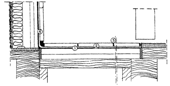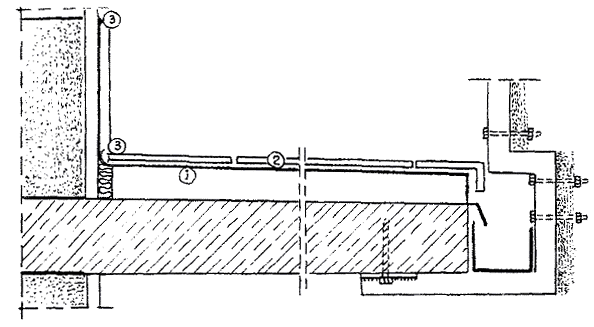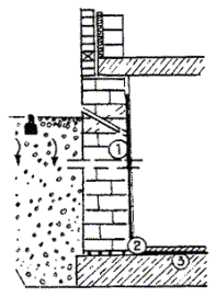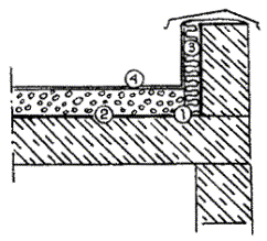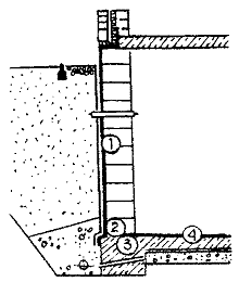 - Состав готовится на рабочем месте в соответствии с ТУ 2312-009-04000633-96. - токсичен и пожароопасен до нанесения на поверхность. - хранение: в стеклянной плотно закрытой таре по ГОСТ 9980-1-86*; срок хранения 1 год. - полимерный состав транспортируют при температуре не выше +30°С. - расход: для покровной обработки на 1 м2 - 0,5 л. 4.3.2. Гидроизоляционное покрытие Аквафин-1К фирмы "Шомбург":- цементосодержащий гидроизоляционный состав для нанесения на поверхности, содержит кварцевый песок, марочный цемент и добавки; - поставляется в виде порошка и готовится в чистой емкости с добавлением необходимого количества чистой воды; - путем размешивания доводится до консистенции, пригодной для работы кистями, щетками или разбрызгивателями и наносится на подготовленную поверхность; - не содержит веществ, разрушающе действующих на арматуру и бетон. - после твердения образует прочное жесткое покрытие. Если на поверхности возможно появление трещин, то такие поверхности должны быть обработаны изоляционным средствами Аквафин -2К. 4.3.3. Эластичная покровная гидроизоляция Аквафин-2К:- эластичное гидроизоляционное покрытие, состоящее из трех весовых частей Аквафина-1К и одной весовой части Унифлекса-Б (жидкого эластификатора); - затвердевшее покрытие Аквафин-2К противостоит негативному давлению грунтовых и стоячих вод и является достаточно эластичным для того, чтобы перекрывать "волосяные" трещины; - применяется также для гидроизоляции поверхностей, покрываемых керамическими плитками (бассейны, резервуары для хранения воды и т.п.) и для террас, балконов, кровли и при реставрации старых зданий; - в холодную дождливую погоду и при сильно увлажненных поверхностях следует предварительно положить грунтовочный связующий слой Аквафин-Ф и сразу же Аквафин-1К. Примеры гидроизоляции подвалов фундаментов, подземных гаражей, балконов, под плитку и т.д. приведены на рис. 4.1; 4.2; 4.3; 4.5; 4.6; 4.7; 4.8; 4,9. 4.3.4. Инструмент для производства работ по покровной гидроизоляции:- для покровной гидроизоляции необходимо иметь чистую посуду, различные кисти, шпатели, перфоратор с насадкой для перемешивания материалов, разбрызгиватель; Рис. 4.1 Гидроизоляция подвалов и фундаментов в новостройках: 1 - гидроизоляция стены; 2 - галтель; 3 -