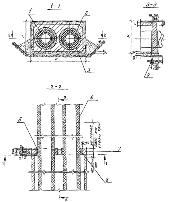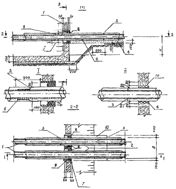 где tмонт. - температура теплопровода в момент монтажа, °С; L - расстояние между двумя пусковыми компенсаторами (L£Lmах). 2.36. После засыпки предварительно нагретых теплопроводов перемещения их отсутствуют (за исключением участков естественной компенсации) и температурные перепады изменяют лишь напряжения в теплопроводах в пределах допустимых значений. 2.37. При использовании метода предварительного нагрева теплопроводов особое внимание обратить на следующее: - примыкающие к врезкам в существующие или проектируемые теплопроводы прямолинейные участки должны иметь длину не более 30 м, при более длинных участках у врезок необходимо устанавливать на них неподвижные опоры на расстоянии не более 12 м от врезки; - на ответвлениях должны свободно обеспечиваться поперечные перемещения путем установки эластичных прокладок. 2.38. При необходимости прокладки тепловых сетей с пенополиуретановой изоляцией в полиэтиленовой оболочке строительные конструкции (камеры, камеры-павильоны, проходные и непроходные каналы, прокладки теплопроводов в футлярах и щитовых тоннелях) должны применяться как и при канальной прокладке. 2.39. Сопряжение бесканальных участков теплопроводов с каналом должно осуществляться путем устройства торцевой стенки с сальниковыми уплотнениями вокруг изолированных теплопроводов (см. рис. 4) или песчаной обсыпкой. 2.40. Проход теплопроводов сквозь стенки камер и фундаменты зданий осуществляется с помощью установки специальных резиновых гильз с последующим бетонированием (бетон В 3,5) в строительной конструкции (см. рис. 5 и 6). 2.41. При невозможности выдержать нормы, предусмотренные СНиП 2.04.07-86", пересечение теплопроводов бесканальной прокладки с газопроводом, водопроводом, электрическими кабелями мощностью до 35 кВ необходимо выполнять по типовым чертежам альбома Мосинжпроекта СК 3105-88 "Конструкции пересечения теплосети с подземными коммуникациями". 2.42. Конструкции железобетонных неподвижных опор для бесканальной прокладки тепловых сетей должны разрабатываться по индивидуальным чертежам на необходимое усилие, определяемое расчетом с учетом местных грунтовых условий. 2.43. Минимальную глубину заложения труб с теплоизоляцией из ППУ в полиэтиленовой оболочке в земле следует принимать не менее 0,5 м вне пределов проезжей части и 0,6 м - в пределах проезжей части, считая до верха теплоизоляции. Допускаемая расчетная глубина заложения теплоизолированных труб должна составлять ориентировочно для диаметров (стальных труб и полиэтиленовых оболочек) до 76´160 мм - 3,1 м, до 159´250 мм - 3,7 м, до 530´710 мм - 3,6 м, до 1020´1200 мм - 2,4 м. Рис. 4. Конструкция сопряжения бесканальной прокладки с канальной: 1 - обратный трубопровод; 2 - подающий трубопровод; 3