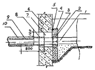 Рис. 6. Конструкция прохода теплопроводов сквозь стены фундамента зданий: 1 -
