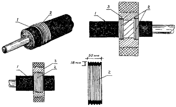 битумной мастике Рис. 5. Конструкция прохода теплопроводов через стены камер, камер-павильонов: 1 - стена камеры; 2 - заводская изоляция труб; 3 -