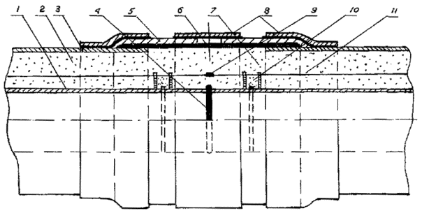 заливочный ППУ; 8 - термоусаживающиеся манжеты с подслоем герметика; 9 -