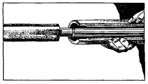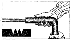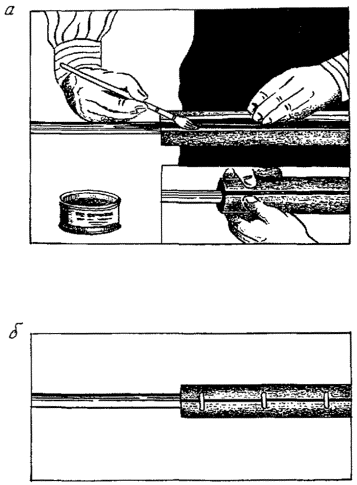 3.1. На трубы малых диаметров (до 15-45 мм) и небольшой длины рекомендуется надевать с торца неразрезанную оболочку вращательным движением (рис. 1). При использовании оболочек с внутренними гофрами для теплоизоляции труб при вращательном движении происходит пригибание верхушек гофр с образованием условно-замкнутых ячеек, улучшающих теплоизоляцию; оболочки легче надевать на трубы и они прочнее держатся. 3.2. При плотном контакте оболочки с трубой (зазор менее 1 мм) оболочки можно не закреплять. При свободном расположении оболочки на трубе рекомендуется закреплять их оборачиванием (и затягиванием до контакта оболочки с трубой) проволокой толщиной 0,5-1,5 мм через каждые 0,5 м по длине и у краев трубы, или оборачивать бандажами из тонкой жести. Затяжка проволокой должна обеспечить соприкосновение оболочки с поверхностью при уплотнении оболочки не более чем до 2 мм от наружной поверхности. 3.3. Для длинных трубопроводов и труб диаметром более 45-60 мм и при наличии отводов рекомендуется использовать оболочки, разрезанные по образующей, которые надевают на трубу с последующим соединением швов (рис. 2). Соединение швов возможно осуществить после проклейки клеем (полиизобутиленовым, эпоксидным, жидким стеклом и т.п.) либо с установкой зажимов на разрезанной оболочке через каждые 20-30 см. Целесообразно также использование зажимов до высыхания и затвердевания клея с последующим их снятием. 3.4. Допускается закрепление краев разрезанных оболочек проволокой диаметром 0,5-1,5 мм или бандажами из тонкой жести через 0,2-0,3 мм и у краев (торцов) оболочки. Ширина зазора разрезанных оболочек должна быть минимальной, не более 0,5 мм. При излишней ширине оболочки допускается ее установка с нахлестом разрезанных концов друг на друга и закреплением верхнего слоя оболочки зажимами. Допускается в отдельных случаях при недостаточной ширине оболочки использование дополнительной вырезанной полосы оболочки, закрепляемой теми же способами. Не допускается оставление неизолированной трубной поверхности после нанесения оболочки Рис. 1. Надевание изоляционной оболочки на трубу вращательным движением с одновременным поджатием гофр Рис. 2 (а, б). Изоляционную оболочку, разрезанную по образующей, раздвигают по разрезу и одевают на трубу с последующим соединением швов; а - соединение швов с помощью