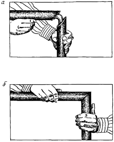 клея; б - соединение швов с помощью зажимов 3.5. фасонные элементы трубных подводок, углы поворотов, отводы, соединения, должны быть изолированы пенополиэтиленовыми оболочками без пропусков и непокрытых участков, без складок изоляции и неплотностей. Толщина изоляции должна быть такой же, что и на линейных участках труб. 3.6. Изоляция углов поворота трубопроводов производится следующим образом. Оболочку примеряют и отмечают место углов поворота, затем ее устанавливают в форму-стусло и специальным ножом делают вырезы, образующие требуемые углы 45° или 30°, а в сумме 90°, после чего оболочки надевают на трубу и ее колена (рис. 3). Оболочки расправляют, места надрезов закрепляют зажимами и (или) проклеивают, после схватывания клея зажимы могут быть удалены. При наличии дефектов и неплотностей на углах можно делать вставку из вырезанного пенополиэтилена и закрепить ее липкой лентой. 3.7. Остроугольный угол поворота труб изолируется с применением оболочек, надрезанных под углом 45° с помощью стусла, затем оболочки надевают в заданном положении с двух сторон и плотно соединяют, после чего закрепляют клеем или зажимами. 3.8. Изоляцию отвода (Т-образного узла) делают с подрезкой оболочки, надеваемой на отвод, по форме изоляции поверхности основной трубы с плотным надеванием вырезанного полукруга до соприкосновения с поверхностью оболочки основной трубы и установкой зажимов в месте соединения (рис. 4 а, б). 3.9. Муфтовые резьбовые соединения труб с выступающей металлической муфтой изолируют оболочкой, в которой предварительно делают внутренний вырез. Затем оболочку устанавливают на трубу и склеивают или закрепляют с помощью зажимов (проволоки, бандажей) (рис. 6 а, б). Рис. 3 а. Для изоляции углов поворота 45° и 30° используют стандартную угловую матрицу (стусло), с помощью которой специальными разрезными ножами делают срезы на оболочке, образующие утлы 45° и 30°