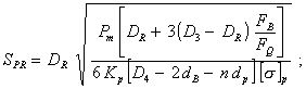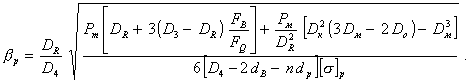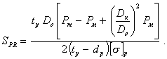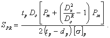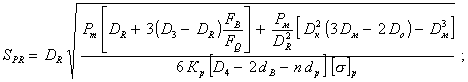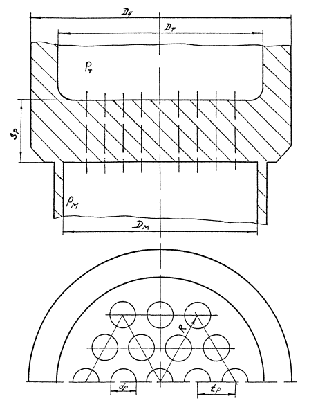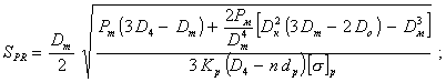 Дата введения 01.01.89 Настоящий руководящий документ распространяется на кожухотрубчатые теплообменные аппараты, работающие под действием внутреннего давления свыше 10 МПа до 100 МПа, применяемые в химической, нефтехимической промышленности, производстве минеральных удобрений и других смежных отраслях промышленности и отвечающие требованиям ГОСТ 11879-81, ОСТ 26-01-221-86, ОСТ 26-291-87, ОСТ 26-1046-87, ГОСТ 14249-80. Настоящий руководящий документ устанавливает нормы и методы расчета толщины трубных решеток (из условия прочности) кожухотрубчатых теплообменных аппаратов с U-образными трубами, с компенсаторами на трубах, с компенсатором на корпусе межтрубного пространства аппарата. Руководящий документ не распространяется на теплообменные аппараты высокого давления, (свыше 10 до 100 МПа), трубные решетки которых спроектированы до 01.01.89 г. и изготовлены до 01.01.91 г. 1. ОБЩИЕ ПОЛОЖЕНИЯ1.1. Условные обозначения C - сумма прибавок к расчетной толщине трубной решетки, мм; Dт - внутренний диаметр камеры трубного пространства аппарата, мм; Dм - внутренний диаметр камеры межтрубного пространства аппарата, мм; Dк - наружный диаметр компенсатора, мм; Dо - диаметр перфорированной части трубной решетки, мм; D3 - диаметр окружности центров шпилек, мм; D4 - наружный диаметр трубной решетки, мм; DR - расчетный диаметр уплотнения, мм; dp - диаметр отверстия в решетке, мм; dт - наружный диаметр трубы, ми; dВ - наружный диаметр резьбы шпильки, мм; FQ - осевая сила от действия давления среды на крышку, Н; FB - расчетное усилие, действующее на шпильки при расчетном давлении, Н; i - количество труб; Kp - поправочный коэффициент; N - число циклов нагружения; Nт - осевое усилие в трубе, Н; n - количество отверстий в наиболее ослабленном сечении решетки; Pm - расчетное давление в камере трубного пространства аппарата, МПа; Рм - расчетное давление в камере межтрубного пространства аппарата, МПа; R - расстояние от оси аппарата до оси наиболее удаленной трубы, мм; SPR - расчетная толщина трубной решетки, мм; Sp - исполнительная толщина трубной решетки, мм; tp - шаг расположения отверстий в решетке, мм; bp - коэффициент толстостенности трубной решетки; d - высота сварного шва в месте приварки трубы к решетке, мм; [s]p- допускаемое напряжение для материала трубной решетки при расчетной температуре, МПа; [s]т - допускаемое напряжение для материала труб, МПа. 1.2. Материалы и требования к конструкции и изготовлению. Материалы, применяемые для изготовления трубных решеток теплообменных аппаратов высокого давления, должны удовлетворять требованиям ОСТ 26-01-135-81. 1.3. Рабочее, расчетное, пробное давления, давление опрессовки. Рабочее, расчетное, пробное избыточные давления и давление опрессовки определяются в соответствии с ГОСТ 14249-80. Расчетная температура трубных решеток определяется по ГОСТ 14249-80. 1.5. Допускаемое напряжение, коэффициенты запаса прочности. 1.5.1. Допускаемое напряжение и коэффициенты запаса прочности принимаются по ГОСТ 25215-82. Прочностные характеристики материала трубной решетки принимаются по ОСТ 26-01-135-81. 1.5.2. Проверку прочности трубных решеток на пробное давление необходимо производить в соответствии с ГОСТ 25215-82 и по формулам (1), (2), (6), (7), (12), (13), (15), (16) настоящего руководящего документа. 1.5.3. При гидравлическом испытании камеры теплообменного аппарата с многослойным корпусом повышенным давлением опрессовки необходимо п