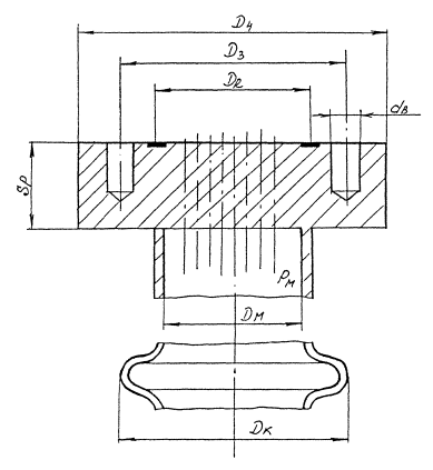 2.3.3. Осевое усилие в трубе для теплообменного аппарата с компенсатором на корпусе межтрубного пространства следует определять по формуле Трубная решетка, жестко связанная с корпусом камеры высокого давления (Рт > Pм). Черт. 1 Трубная решетка, жестко связанная с корпусом камеры высокого давления (Рт < Pм). Черт. 2 Коэффициент Kp Черт. 3 3. РАСЧЕТ ТОЛЩИНЫ ТРУБНОЙ РЕШЕТКИ С РАЗЪЕМНЫМ СОЕДИНЕНИЕМ РЕШЕТКИ С КОРПУСОМ КАМЕРЫ ВЫСОКОГО ДАВЛЕНИЯ3.1. Теплообменные аппараты с U-образными трубами или компенсаторами на трубах (Рт > Pм). 3.1.1. Толщину трубной решетки следует рассчитывать по формулам: 3.1.2. Осевая сила FQ и расчетное усилие определяются по ГОСТ 26303-84. 3.1.3. Диаметр перфорированной части трубной решетки Do следует определять по формуле (3). 3.1.4. Величину коэффициента Kp в зависимости от толстостенности трубной решетки bp следует определять в соответствии с черт. 3. 3.1.5. Величину коэффициента толстостенности трубной решетки следует определять по формуле 3.1.6. Расчетную толщину трубной решетки следует принимать наибольшей из двух значений SPR, определенных по формулам (12), (13). 3.1.7. Исполнительная толщина трубной решетки должна удовлетворять условию (5) и требованию п. 2.1.6. 3.1.8. Проверка прочности крепления труб в решетке должна проводиться по п. 2.3. 3.2. Теплообменные аппараты с компенсатором на корпусе межтрубного пространства в соответствии с черт. 4. 3.2.1. Толщину трубной решетки следует рассчитывать по формулам: 3.2.2. Диаметр перфорированной части трубной решетки следует определять по формуле (3). 3.2.3. Осевая сила FQ и расчетное усилие FB определяются по ГОСТ 26303-84. 3.2.4. Величину коэффициента Kp следует определять в соответствии с черт. 3. 3.2.5. Величину коэффициента толстостенности трубной решетки следует определять по формуле 3.2.6. Расчетную толщину трубной решетки следует принимать наибольшей из двух значений, определенных по формулам (15), (16). 3.2.7. Исполнительная толщина трубной решетки должна удовлетворять условию (5) и требованию п. 2.1.6. 3.2.8. Проверка прочности крепления труб в решетке должна проводиться по п. 2.3. Трубная решетка с разъемным