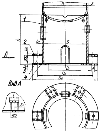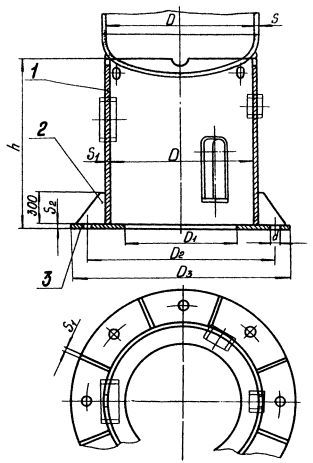 о НИР, № гос. рег. 01890006650, УкрНИИхиммаш, Харьков, 1989. 8. Высота цилиндрических опор h должна быть на менее 600 мм; высота выбирается конструктивно по условиям эксплуатации аппарата. 9. Опоры должны изготовляться в соответствии с требованиями настоящего стандарта, требованиями ОСТ 26-291-87, по чертежам, утвержденным в установленном порядке. 10. При приварке опор из углеродистых сталей к аппаратам из коррозионно-стойких сталей длина переходной обечайки из коррозионно-стойких сталей определяется в соответствии с обязательным приложением 2. 12. Необходимое количество отверстий, лазов (люков), их размеры, расположение и форма выбираются из условий эксплуатации и монтажа и должны соответствовать требованиям ОСТ 26-291-87 и ГОСТ 24757-81. 13. Для вентиляции полости опоры в верхней части должно быть предусмотрено не менее двух отверстий диаметром 100 мм. При приварке опор к днищам, сваренным из отдельных частей, в обечайках опор необходимо предусмотреть вырезы, позволяющие иметь доступ к сварным радиальным швам на днищах. В этом случае отверстия для вентиляции не предусматриваются. 14. Конструкция и технические требования для фундаментных болтов должны соответствовать требованиям ГОСТ 24379.0-80 и ГОСТ 24379.1-80. 15. Формулы для определения расстояния между опорой и осью сварного соединения днища с корпусом и числовые значения расстояний приведены в рекомендуемом приложении 4. 16. Формулы для подсчета массы опор даны в справочном приложении 5. 17. Монтажные нагрузки должны определяться и учитываться дополнительно монтажными организациями при определенном способе подъема аппаратов, кроме случаев подъема аппарата методом скольжения с отрывом от земли, для которого дополнительной проверки не требуется. 18. В опорах аппаратов с массой свыше 100 т должны быть предусмотрены устройства для перевода аппаратов из горизонтального положения в вертикальное. Тип 1 Опоры цилиндрические с местными косынками 1 - обечайка; 2 - косынка; 3 - кольцо нижнее. Черт. 1. Примечание. Количество косынок должно