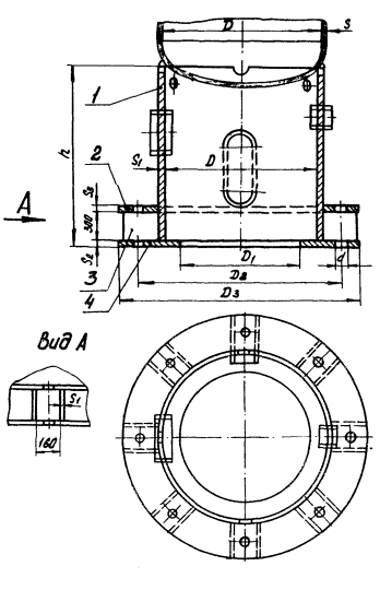 0,75 толщины планки s3 Тип 3 Опоры цилиндрические с кольцевым опорным поясом 1 - обечайка; 2 - кольцо верхнее; 3 - ребро; 4 -