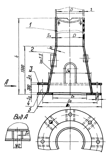 кольцо нижнее Черт. 3. Тип 4 Опоры конические с кольцевым опорным поясом 1 - обечайка; 2 - обечайка коническая; 3 - кольцо
