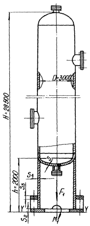 Примеры выбора опор 2.1. Пример выбора опоры высотой h = 2000 мм для колонного аппарата с D = 3000 мм, Н = 28500 мм. 2.1.1. Исходные данные. Вес аппарата - в рабочих условиях G1, MH 2 - в условиях испытания G2, МН 3,2 - в условиях монтажа (минимальный) G4, МН 0,8 Изгибающий момент в сечении YY от действия ветровых нагрузок: - в рабочих условиях Mv1, МН·м 0,9 - в условиях испытания Mv2, МН·м 1,0 - в условиях монтажа (без изоляции) Mv3, МН·м 0,85 - в условиях монтажа (с изоляцией) Mv4, МН·м 0,95 Изгибающий момент в сечении YY от действия эксцентричных весовых нагрузок - в рабочих условиях MG1, МН·м, 0,2 - в условиях испытания MG2, МН·м 0,25 - в условиях монтажа (без изоляции) MG3, МН·м 0,15 Аппарат установлен в зоне с сейсмичностью не более 6 баллов.