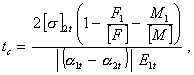 где [s]2t - допускаемое напряжение для материала опорной обечайки при температуре в стыке, МПа; E1t - модуль Юнга для материала переходной обечайки при температуре в стыке, МПа; a1t, a2t - температурные коэффициенты линейного расширения материалов переходной и опорной обечаек при температуре в стыке, 1/°С; [F] и [M] - допускаемые осевое сжимающее усилие (МН) и изгибающий момент (МН·м) на опорную обечайку; определяются по ГОСТ 14249-89 для рабочих условий (при температуре в стыке). Температуру в месте стыка