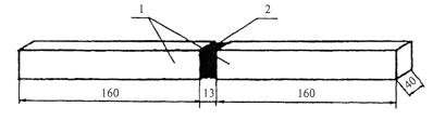 устанавливают на ноль и включают установку. 1 - бетонные балочки; 2 - герметик Рисунок 4 - Образец деформационного шва