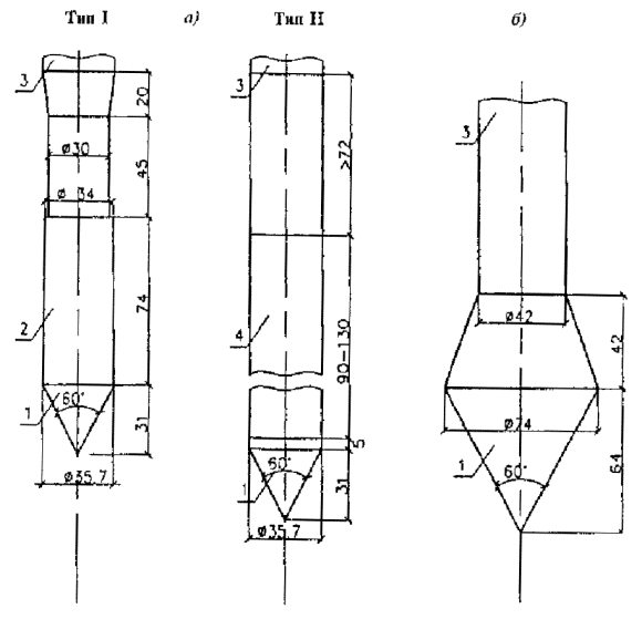 (обязательное) Схемы конструкций зондовa - для статического зондирования; б - для динамического зондирования (ударного); 1 -