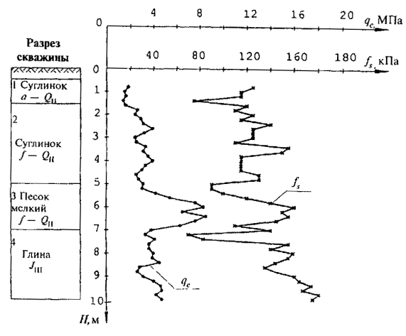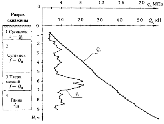 грунта под наконечником (конусом) зонда qс; общее сопротивление грунта