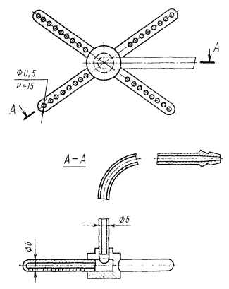 5). Пробоотборник Черт. 3 4.10. Температуру продуктов сгорания на выходе из аппарата (п. 5 табл. 1) следует определять термометром с ценой деления 2,5 °С при работе аппарата на номинальной тепловой мощности и перепаде температур воды (25 ± 1) °С. Термометр должен быть установлен после стабилизатора тяги на расстоянии 200 мм от него. (Измененная редакция, Изм. № 6). 4.11. Номинальную тепловую мощность запальной горелки (п. 6 табл. 1) должны определять по методике п. 4.6 при неработающей основной горелке. 4.6 - 4.11. (Измененная редакция, Изм. № 2). 4.12. Проверку аппарата на соответствие требованиям пп. 2.2 - 2.8 следует проводить визуально. 4.13. При периодических и типовых испытаниях проверка герметичности (п. 2.10) - по СТ СЭВ 4221-83. Черт. 4. (Исключен, Изм. №